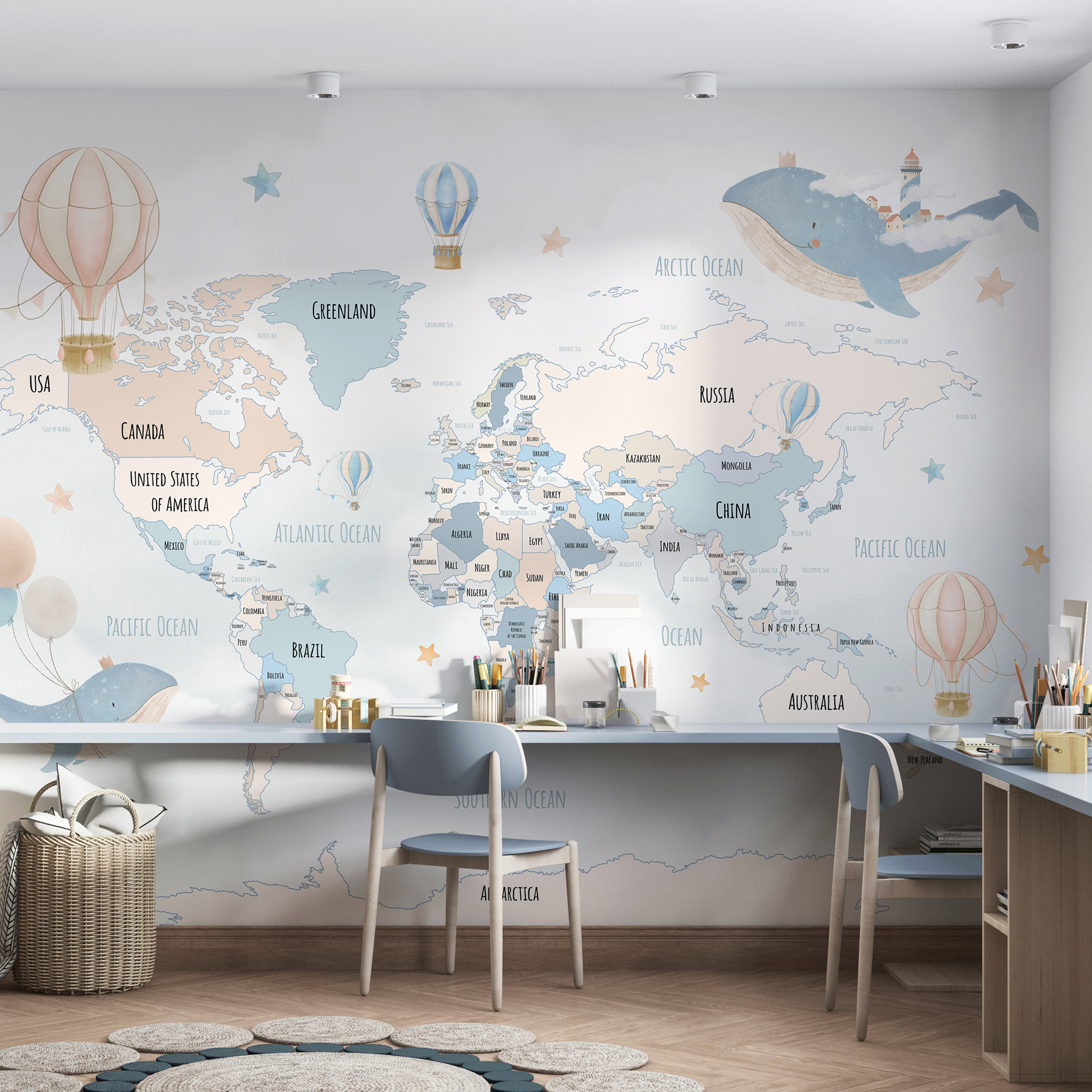 Stel je voor dat je een vleugje eigenzinnigheid toevoegt aan de kamer van je kind met deze prachtige “Fotobehang Blue and White Hot Air Balloon”. Het is perfect om de verbeelding van kleine kinderen te prikkelen, met charmante heteluchtballonnen, kaartdetails en schattige dieren. Stel je de gloed voor van een zacht namiddaglicht dat zachte schaduwen werpt, waardoor verhaaltjes voor het slapen gaan aanvoelen als wereldwijde avonturen. Elk detail belooft een muur te veranderen in een paspoort voor dromen – kinderen kunnen naar Brazilië of Australië wijzen en hun nieuwsgierigheid de vrije loop laten. Het is niet zomaar een muurschildering; het is een dagelijkse uitnodiging om je te verwonderen, te ontdekken en groots te dromen. En die zachte pasteltinten? Ze passen naadloos in elk interieur en geven het een serene maar toch speelse sfeer. Perfect om kinderkamers en speelzalen een magisch tintje te geven.