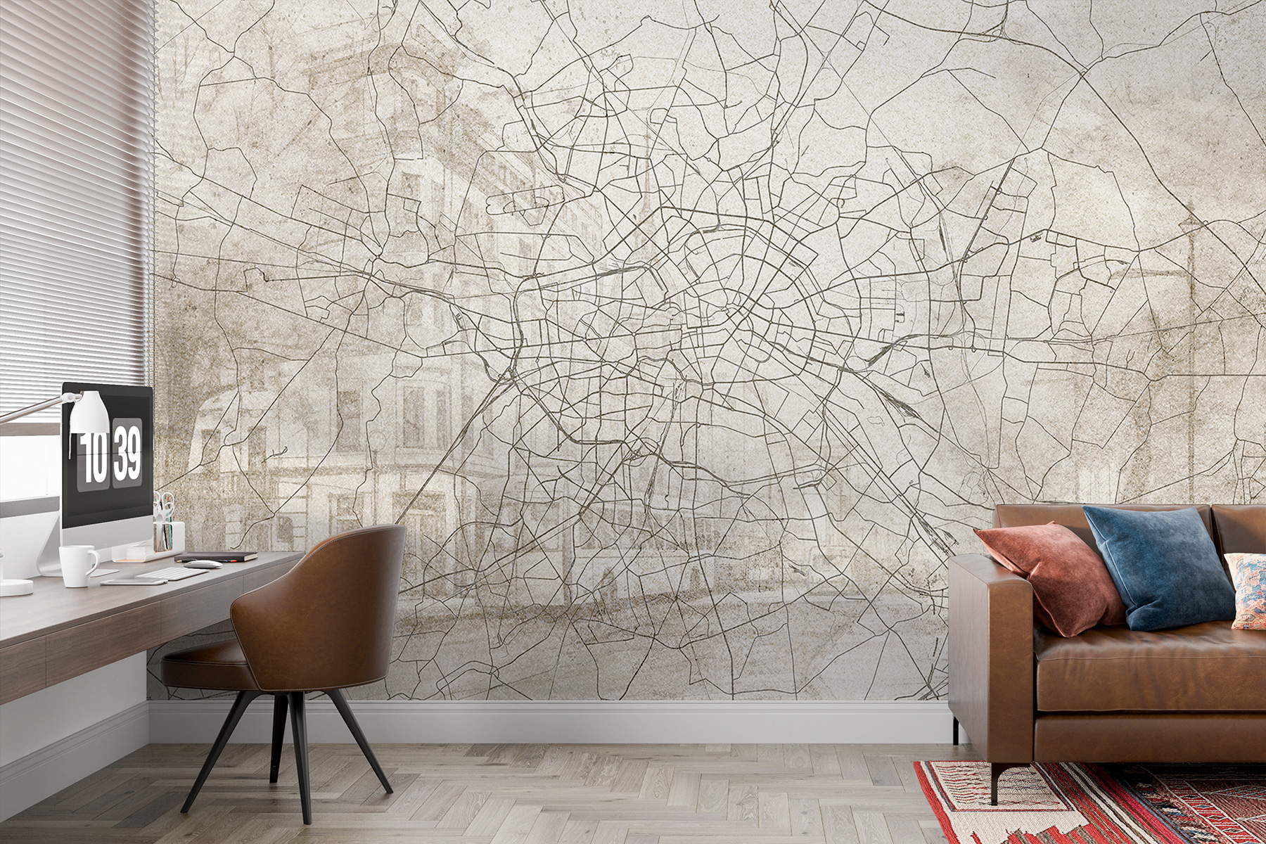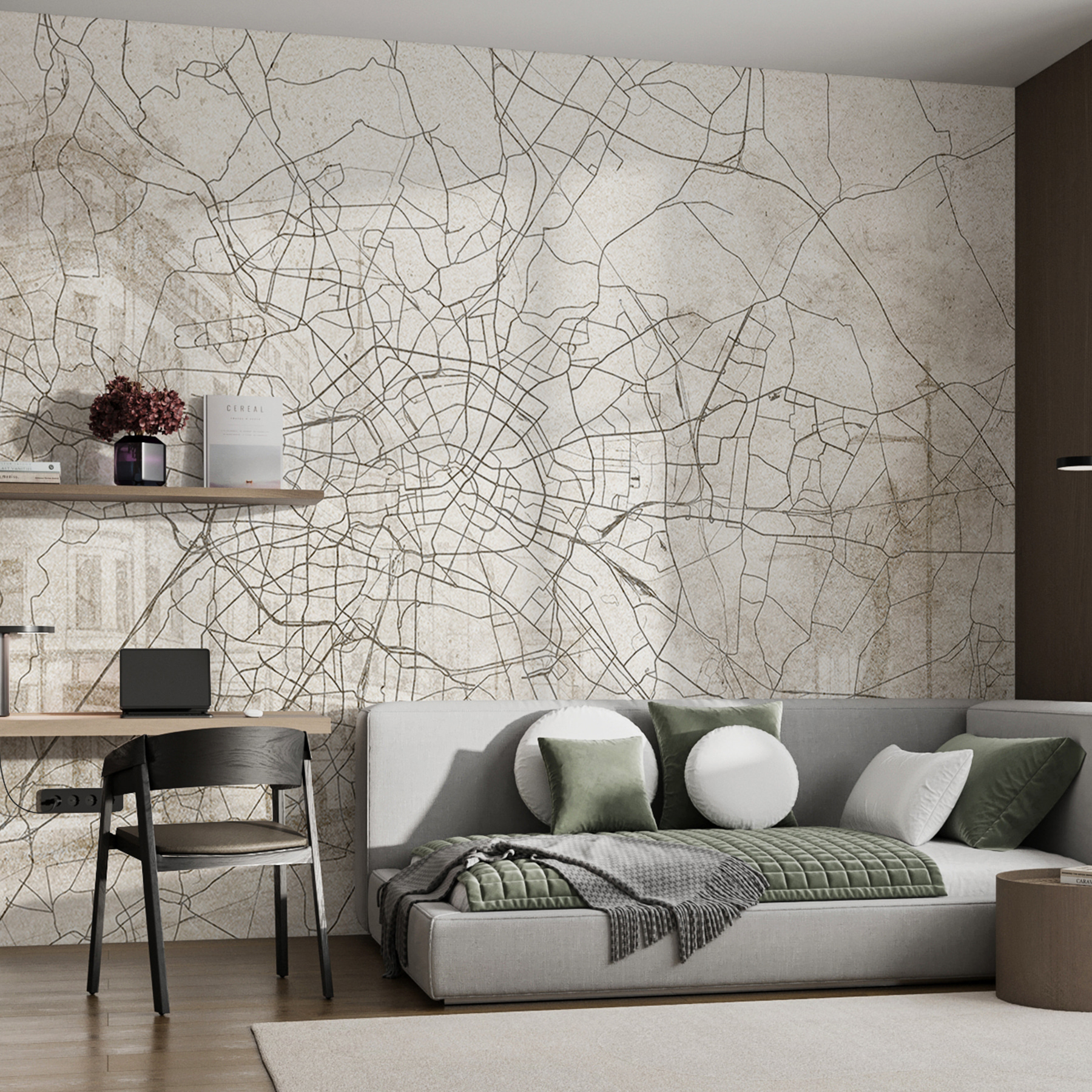 Stel je voor dat je een kamer binnenloopt en begroet wordt door een ingewikkelde kaartschildering die de geheimen van een stad onthult. Het is alsof je in vogelvlucht op je bank zit. Deze muurschildering vertelt verhalen over kronkelende wegen en verborgen paden, alsof je een moderne ontdekkingsreiziger bent – zonder de blaren. De aardetinten sluiten naadloos op elkaar aan en er is een vleugje nostalgie vermengd met avontuur. Perfect voor dromers en zwervers die houden van een goede dagdroom vol reislust. Het zal zeker gesprekken opwekken – iedereen houdt ervan om te verdwalen in een goede kaart!