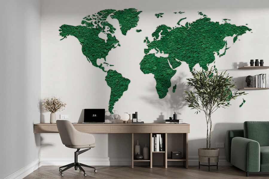 Tover elke ruimte om in een gezellige wereldreis met deze prachtige muurschildering van de wereld. Het is niet zomaar een kaart; het is een weelderig, groen avontuur dat wacht om zich te ontvouwen. Stel je voor dat je koffie drinkt en naar die levendige continenten kijkt – wie weet inspireert het tot spontane reisplannen of dagdromen over verre oorden. De textuur geeft een natuurlijke sfeer, bijna alsof de aarde zelf deel uitmaakt van je kamer. Deze muurschildering is perfect voor een woonkamer, kantoor of zelfs een serene leeshoek. Elke blik kan een gesprek op gang brengen, of op zijn minst een grinnik over aardrijkskunde-ongelukjes. Duik in de schoonheid en laat het de ontdekkingsreiziger in jou inspireren!