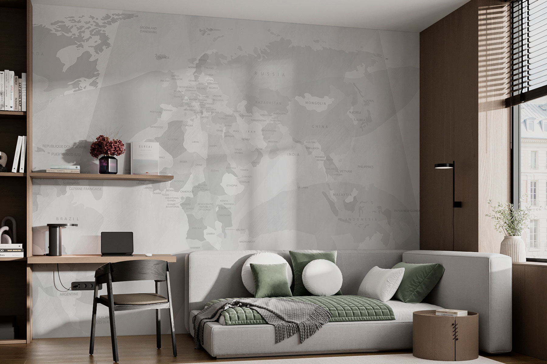 Verander een saaie muur in een wereld vol avontuur met de ‘Wall Murals Map of the World’. Stel je voor dat je koffie drinkt en met je vinger over verschillende landen gaat, terwijl je droomt van verre landen. Deze unieke muurschildering is niet alleen decoratie, maar ook een gespreksstarter. Vrienden zullen versteld staan van het stijlvolle ontwerp, terwijl jij terloops leuke weetjes kunt vertellen over de plaatsen waar je bent geweest – of waar je graag heen zou willen. De zachte kleuren creëren een rustige sfeer, waardoor het perfect is voor een gezellig leeshoekje of een levendige woonkamer. Je ruimte zal uitnodigender aanvoelen, en wie weet inspireert het je zelfs tot een spontane reis!