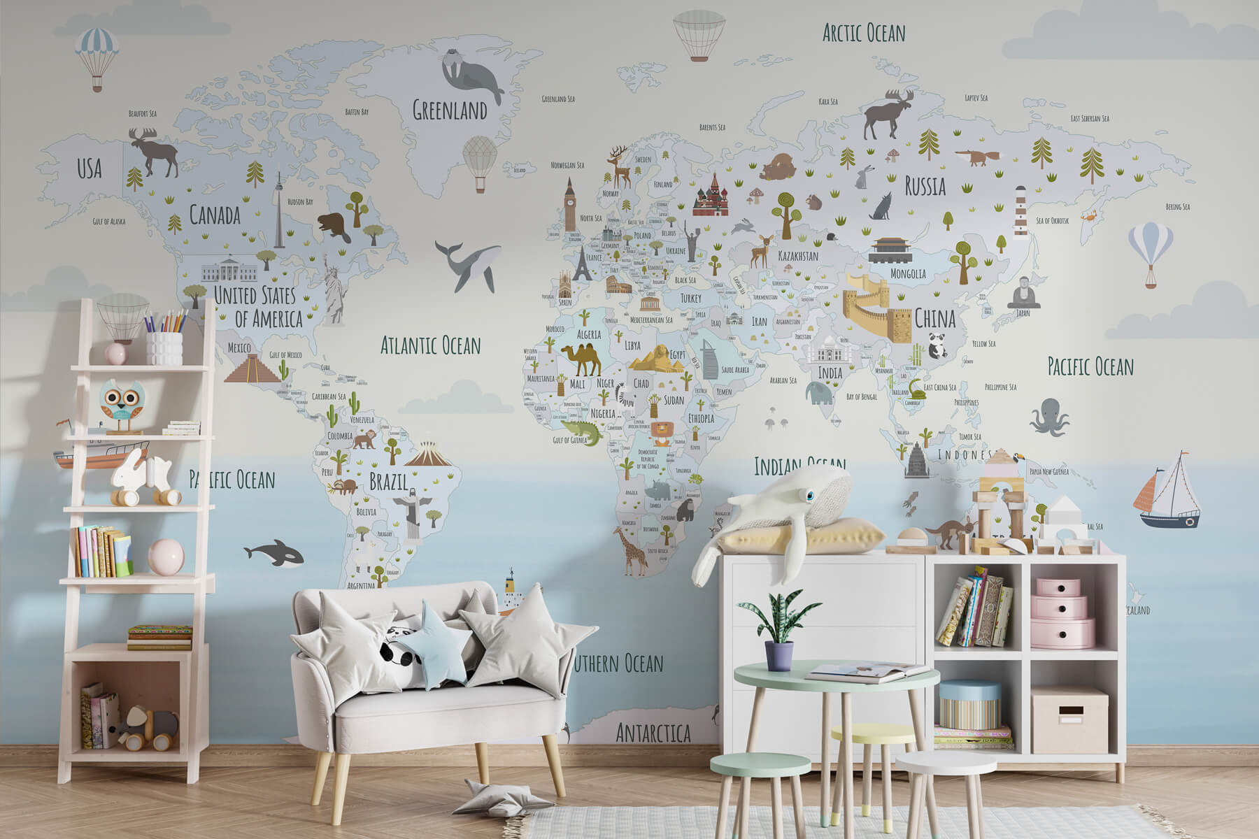 Transformeer elke ruimte met deze prachtige muurschildering met een kleurrijke wereldkaart en charmante dieren. Perfect voor nieuwsgierige kinderen of iedereen die jong van hart is, het stimuleert de verbeelding en het avontuur. Stel je voor dat een kleintje zijn favoriete wezens aanwijst terwijl hij droomt van verre landen – pure magie! De zachte tinten creëren een ontspannen sfeer, ideaal voor slaapkamers of speelkamers. Het is als een open uitnodiging om te ontdekken, te leren en te dagdromen over wilde reizen. Een prachtig middelpunt dat de muren echt tot leven brengt en van elke blik een kleine reis maakt!