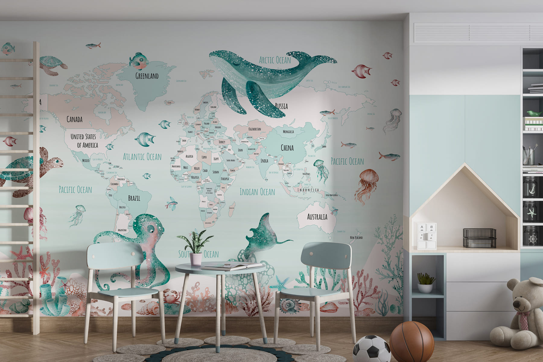 Maak van elke kinderkamer een grillig onderwateravontuur met deze levendige wereldkaart met charmante zeedieren. Stel je voor dat kleintjes met grote ogen naar vriendelijke schildpadden, speelse dolfijnen en nieuwsgierige octopussen staren, waardoor hun verbeelding wordt geprikkeld terwijl ze leren over oceanen en continenten. De zachte kleuren creëren een rustgevende sfeer, perfect voor dromerige nachten of knuffelen tijdens verhaaltjes. Het is niet alleen decor; het is een oceaanuitstapje op de muren! Deze muurschildering kan elke ruimte veranderen in een spetterende oase van plezier, waar elke dag voelt als een nieuwe reis. Wie zou daar niet in willen duiken?