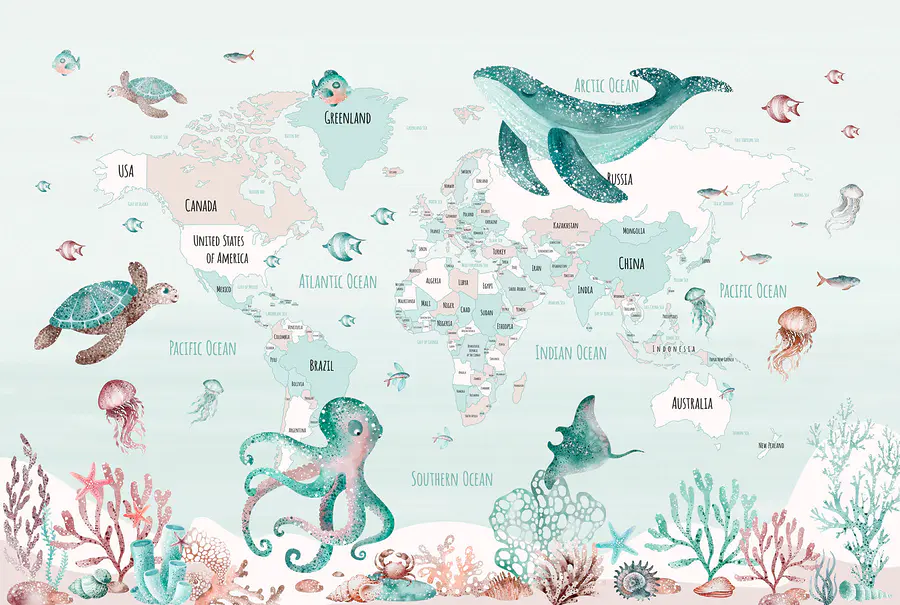Maak van elke kinderkamer een grillig onderwateravontuur met deze levendige wereldkaart met charmante zeedieren. Stel je voor dat kleintjes met grote ogen naar vriendelijke schildpadden, speelse dolfijnen en nieuwsgierige octopussen staren, waardoor hun verbeelding wordt geprikkeld terwijl ze leren over oceanen en continenten. De zachte kleuren creëren een rustgevende sfeer, perfect voor dromerige nachten of knuffelen tijdens verhaaltjes. Het is niet alleen decor; het is een oceaanuitstapje op de muren! Deze muurschildering kan elke ruimte veranderen in een spetterende oase van plezier, waar elke dag voelt als een nieuwe reis. Wie zou daar niet in willen duiken?