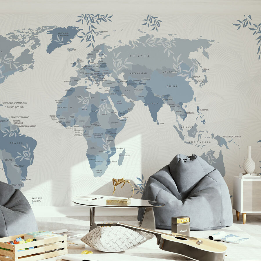 Hallo daar! Kijk eens naar deze prachtige muurschildering, bekend als “Fotobehang w08211v4”. Zie het als de perfecte mix tussen een wereldkaart en een kunstwerk – leuk, hè? Het valt in de categorieën “Muurschilderingen met wereldkaart” en “Populaire muurschilderingen”. Met zijn rustgevende blauw- en grijstinten is het net een zacht wereldavontuur voor je muren. Geschilderde bladeren zweven over de continenten, waardoor het niet zomaar een kaart is, maar een grillige reis. Stel je voor dat je ‘s ochtends aan je koffie nipt en met je vinger over verre plaatsen strijkt, dromend over je volgende reis… of terugdenkend aan de vorige. Deze muurschildering is perfect voor iedereen die een beetje reislustig is of die graag zijn of haar interieur opfleurt met iets unieks. Het verandert elke kamer in een instant conversatie starter – wie weet waar het volgende verhaal je zal brengen? 🌿🌍
