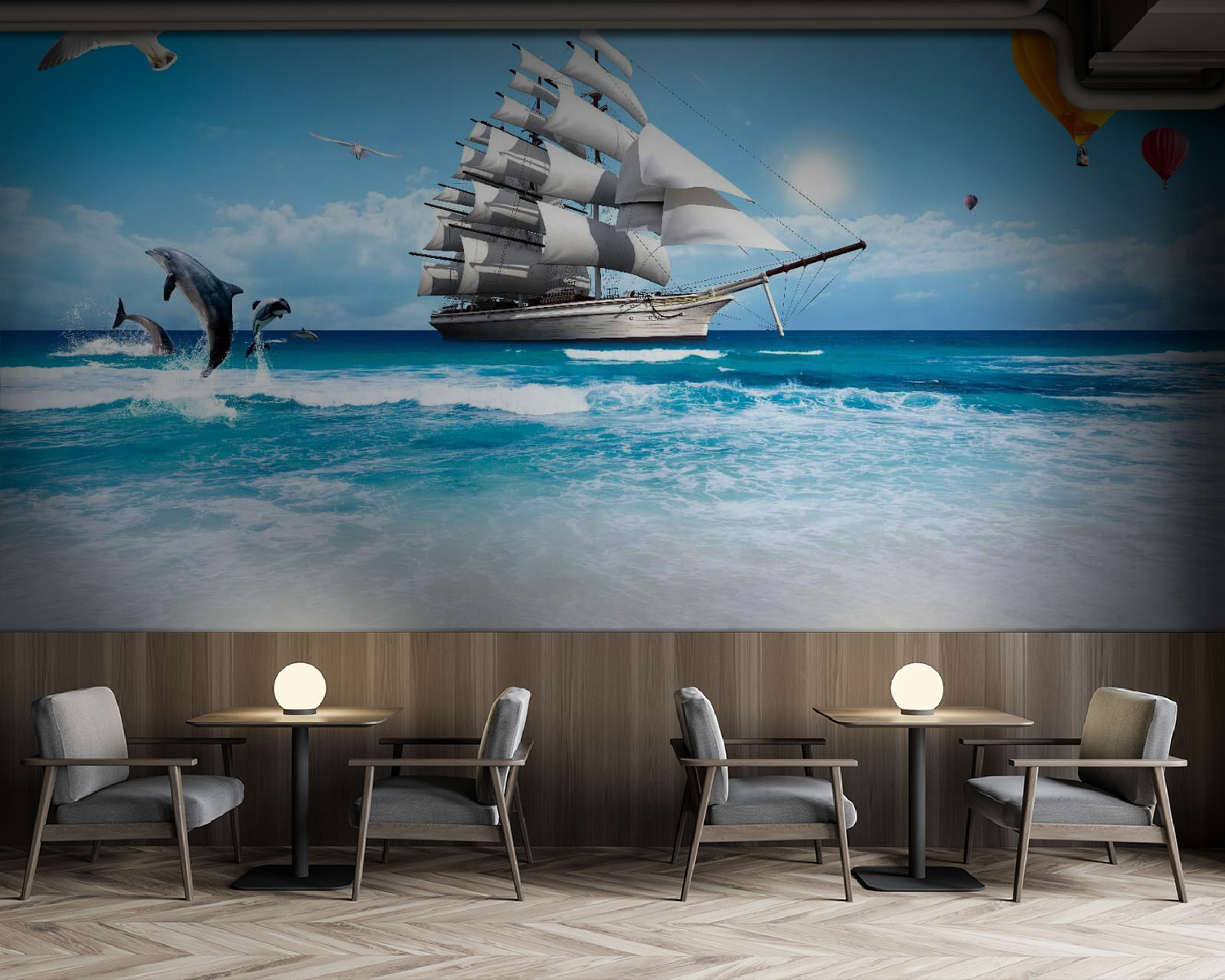 Fleur een kamer op met de betoverende sfeer van deze muurschildering met rode heteluchtballonnen die dansen in de lucht! Stel je voor dat je je kamer binnenstapt en begroet wordt door een vleugje kleur en eigenzinnigheid. Het is alsof je elke dag een minivakantie hebt, gewoon op je muur. Perfect voor iedereen die ervan droomt om hoog te zweven en het avontuur te omarmen. Stel je voor dat je ‘s ochtends aan je koffie nipt terwijl de serene schoonheid van een sfeer aan zee je hart verovert. En laten we eerlijk zijn: wie zou er niet houden van een eigenzinnige zeemeeuw of speelse dolfijn die zijn opwachting maakt in dit verrukkelijke tafereel? Het zorgt gegarandeerd voor vreugde en verbeelding. Je muren zullen er nooit meer saai uitzien!