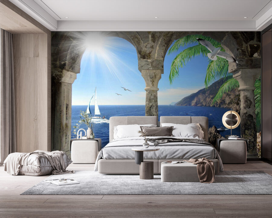 Stap binnen in een stukje paradijs met de muurschildering “Uitzicht op de oceaan vanaf een stenen boog”. Stel je voor dat je wakker wordt met het zachte geluid van golven en de geur van zilte lucht, allemaal vanuit het comfort van je woonkamer. Deze muurschildering creëert een kleine ontsnapping, waardoor het voelt alsof er altijd een zonnige dag voor de deur staat. Die hoogvliegende meeuwen en de charmante zeilboot passen perfect bij het zachte wiegen van de palmbomen, die ontspanning fluisteren. Het is net een vakantie zonder dat u hoeft in te pakken! Perfect voor iedereen die houdt van de charme van de kust en zijn ruimte een beetje magischer wil maken. Denk eens aan de gesprekken die het zal opleveren – wie houdt er nou niet van een goed strandverhaal? En hé, u heeft geen zonnebrandcrème nodig!