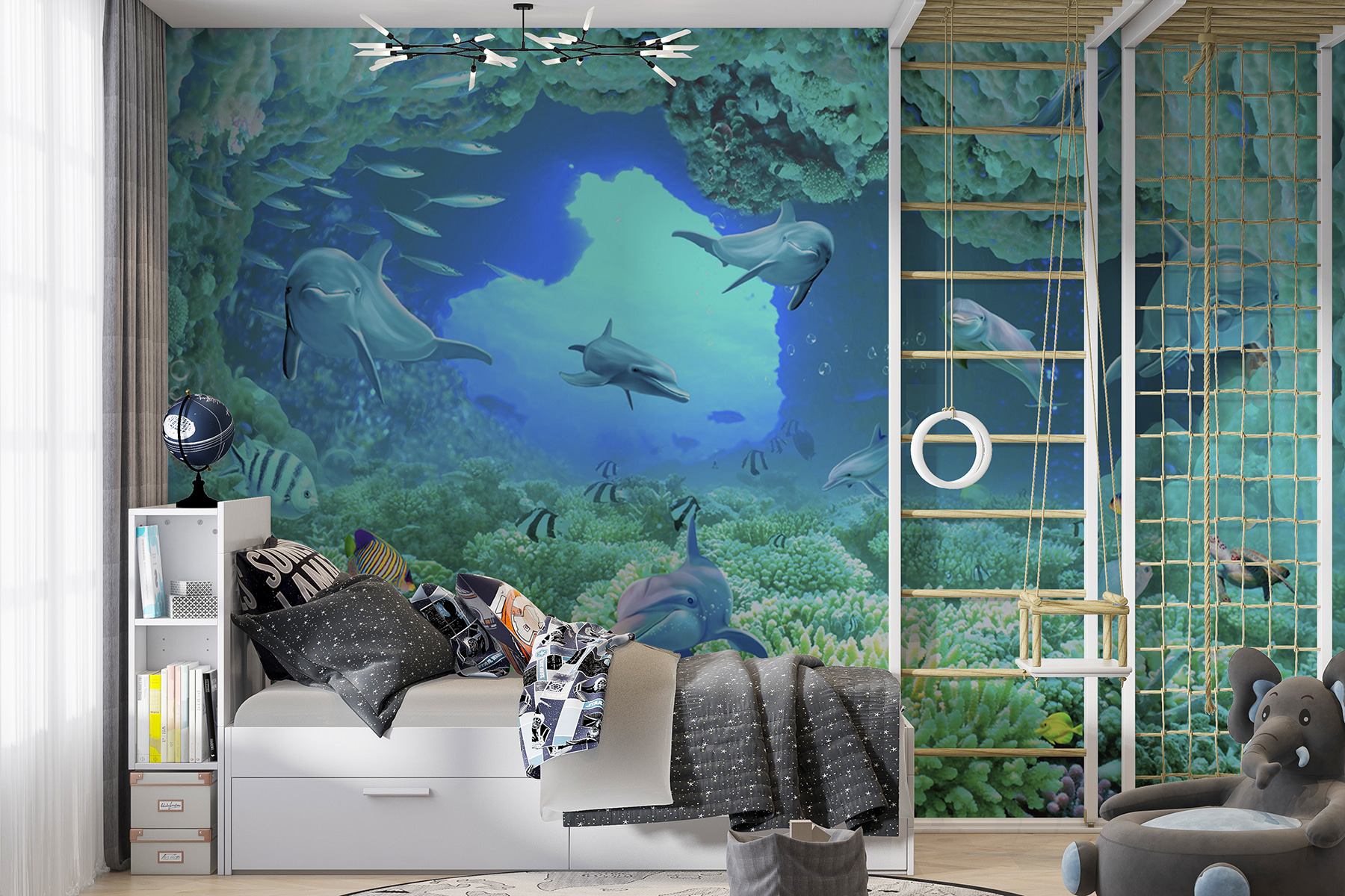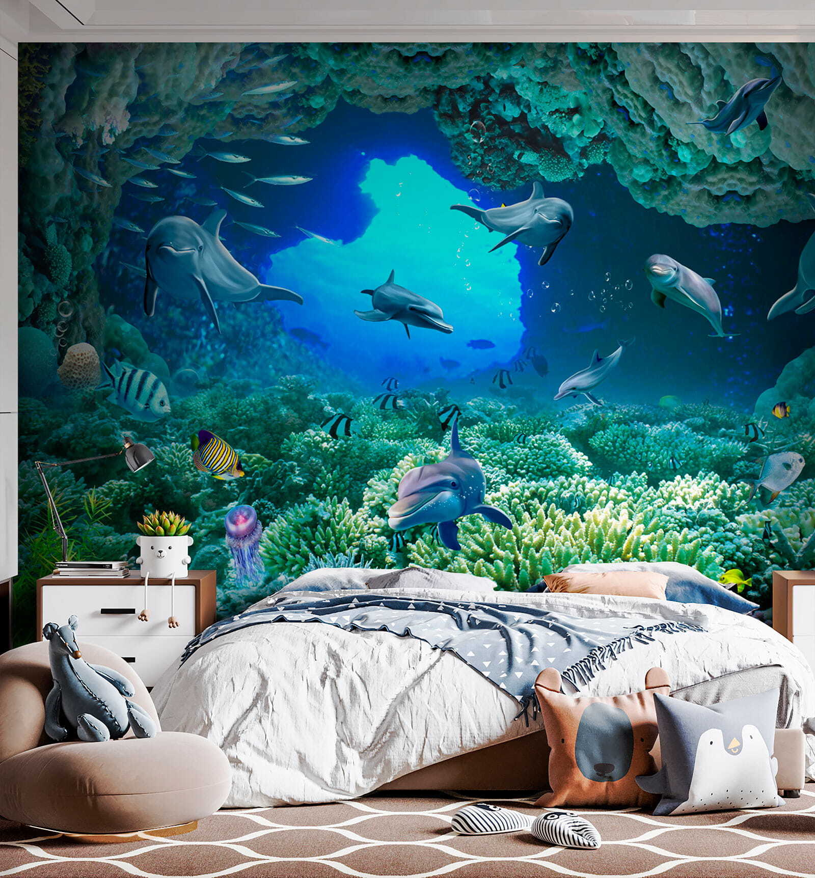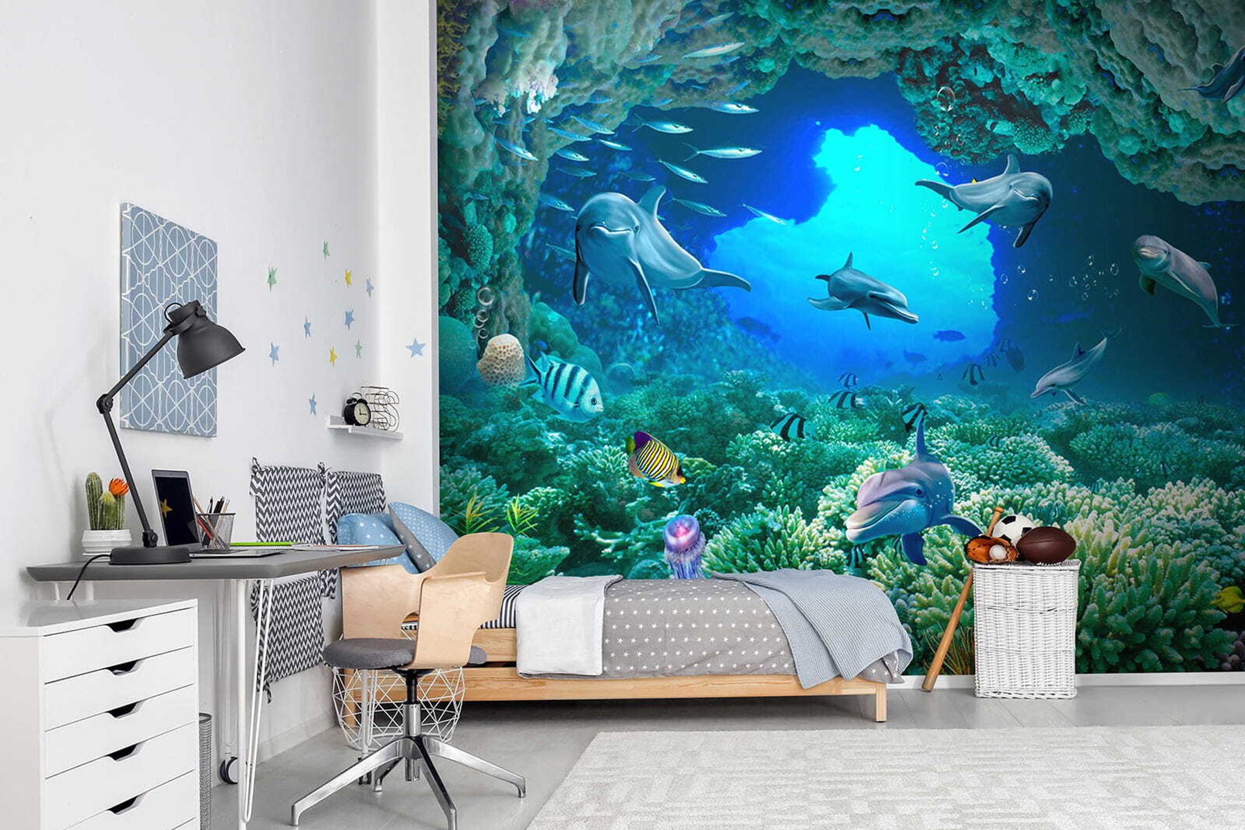 Duik direct in de magie van het diepe blauw met deze prachtige muurschildering – “Dolfijn zwemt in het water”! Stel je voor dat je wakker wordt met deze levendige onderwaterwereld in je woon- of slaapkamer. De dolfijnen zien er zo gelukkig en speels uit, alsof ze je uitnodigen om met hen mee te doen! De levendige kleuren en ingewikkelde details van het koraal en de vissen geven je het gevoel dat je aan het snorkelen bent in tropische wateren… zonder je huis te verlaten. Serieus, het is een enkele reis naar de zee en wie heeft daar geen behoefte aan! Zowel kinderen als volwassenen zullen dol zijn op de serene en toch avontuurlijke energie die deze muurschildering uitstraalt – het is net een aquarium, maar dan zonder het onderhoud. Perfect voor elke kamer die een vleugje leven en een vleugje eigenzinnigheid nodig heeft – installeer het en maak je klaar om elke dag weer onder de indruk te zijn!