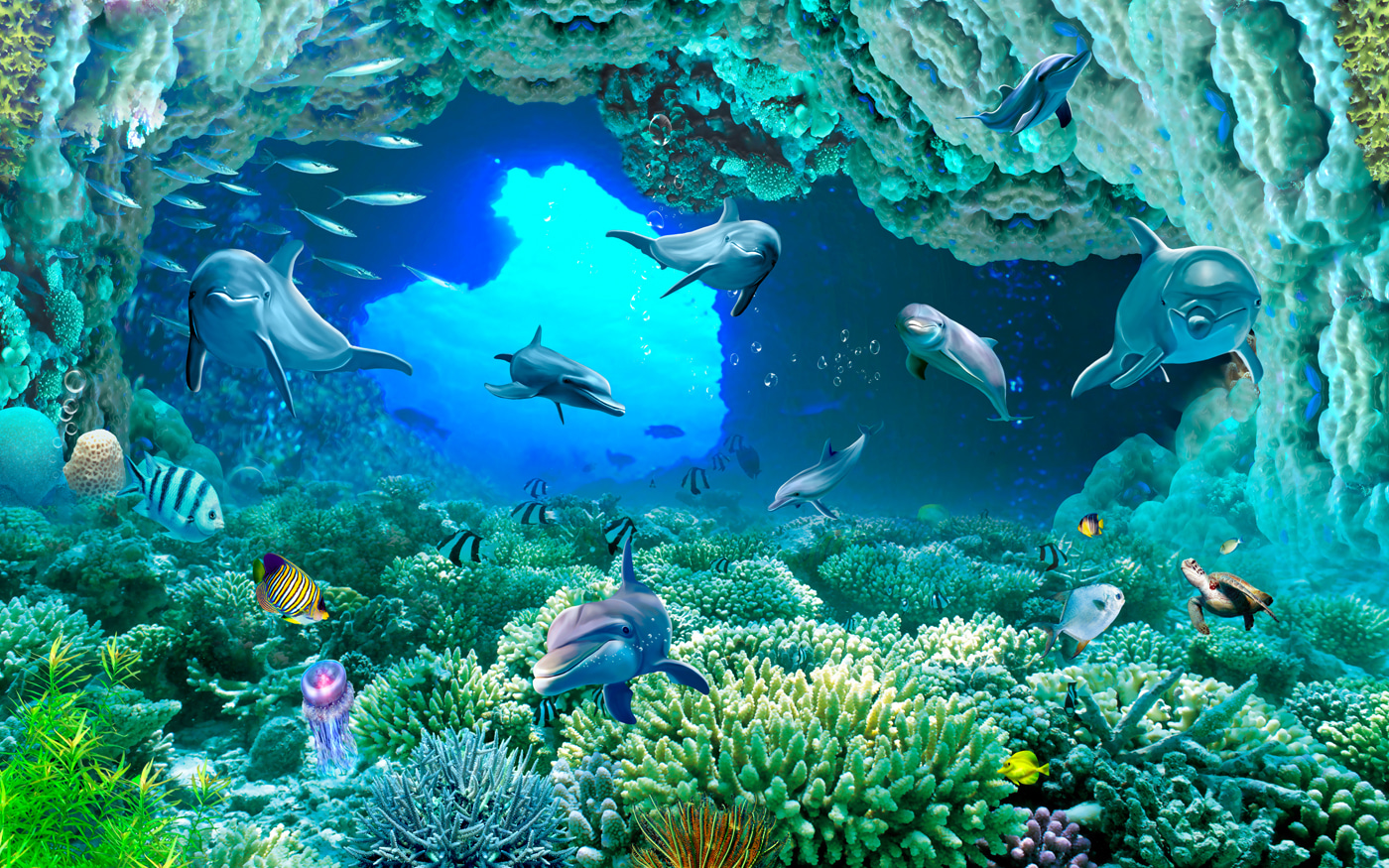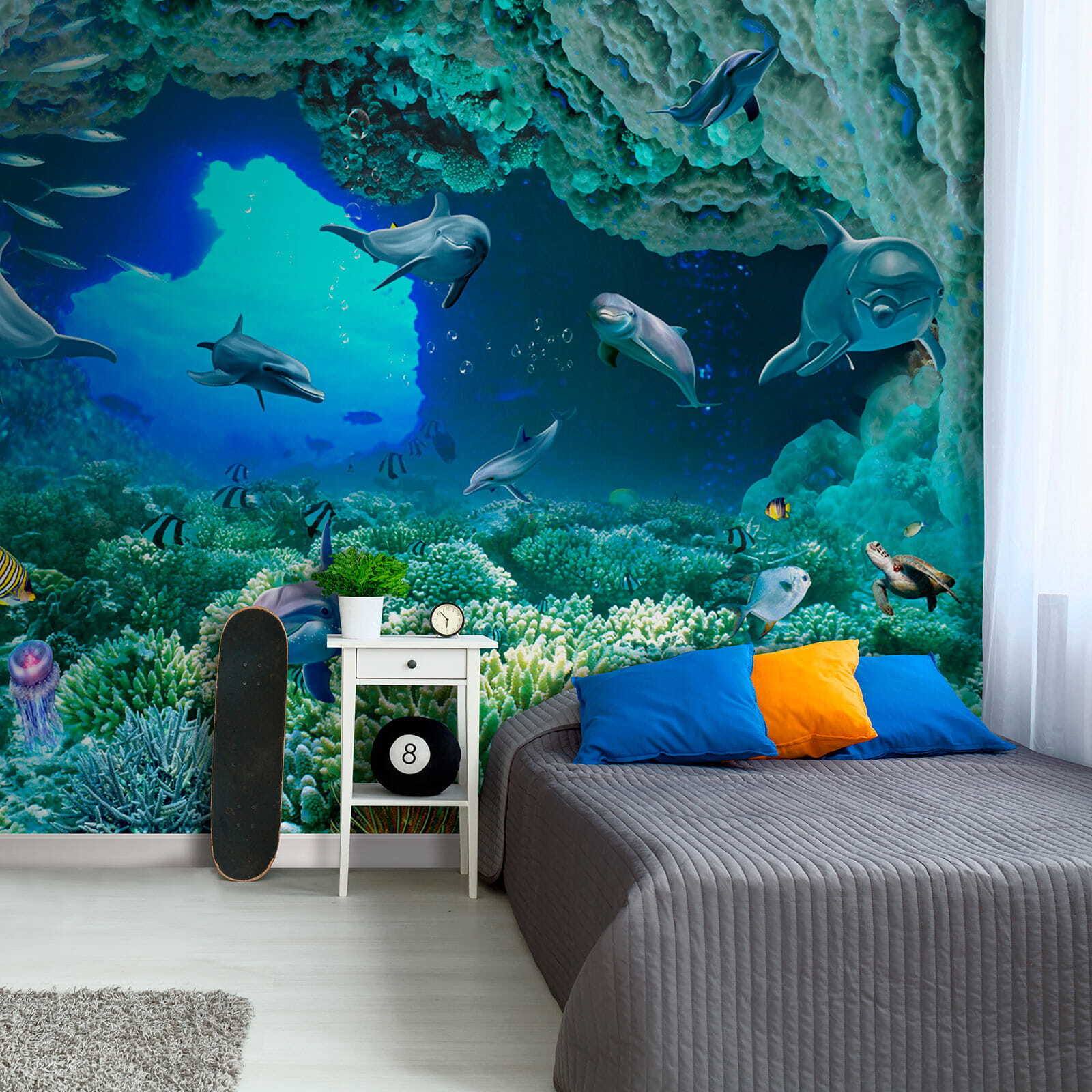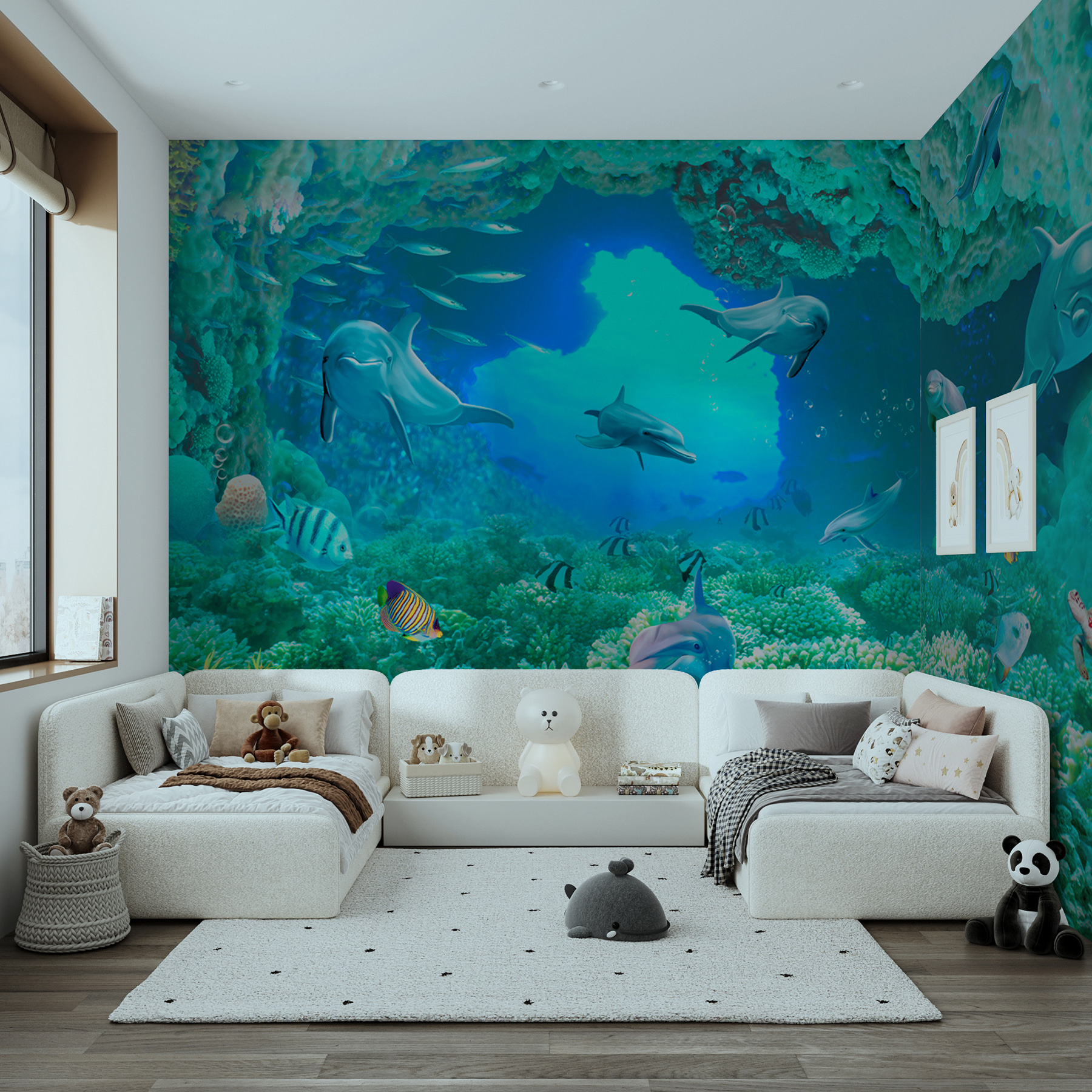 Duik direct in de magie van het diepe blauw met deze prachtige muurschildering – “Dolfijn zwemt in het water”! Stel je voor dat je wakker wordt met deze levendige onderwaterwereld in je woon- of slaapkamer. De dolfijnen zien er zo gelukkig en speels uit, alsof ze je uitnodigen om met hen mee te doen! De levendige kleuren en ingewikkelde details van het koraal en de vissen geven je het gevoel dat je aan het snorkelen bent in tropische wateren… zonder je huis te verlaten. Serieus, het is een enkele reis naar de zee en wie heeft daar geen behoefte aan! Zowel kinderen als volwassenen zullen dol zijn op de serene en toch avontuurlijke energie die deze muurschildering uitstraalt – het is net een aquarium, maar dan zonder het onderhoud. Perfect voor elke kamer die een vleugje leven en een vleugje eigenzinnigheid nodig heeft – installeer het en maak je klaar om elke dag weer onder de indruk te zijn!