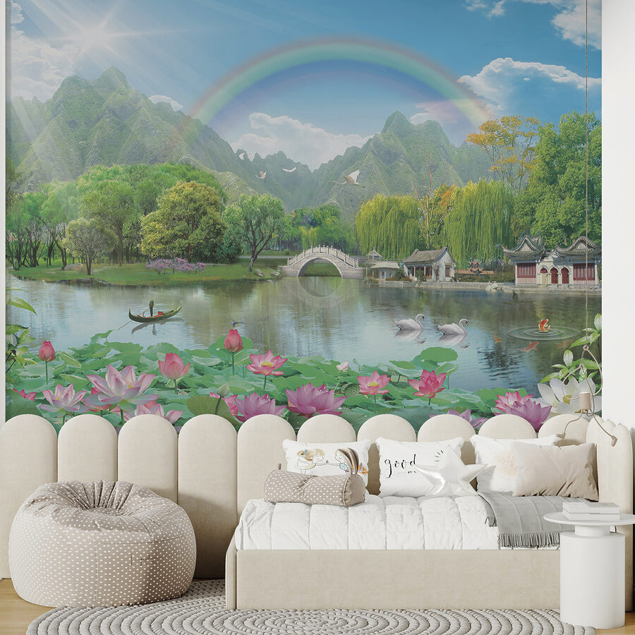Stel je voor dat je een kamer binnenstapt en wordt meegevoerd naar een sereen paradijs aan een meer… Kun je het voelen? Dat is precies wat deze muurschildering doet. “Serene landschap met lotusbloemen’ is als een zachte zucht voor je ziel – kalmerend en rustgevend. Perfect voor kinderkamers of elke andere ruimte die een vredig tintje nodig heeft. Stel je voor dat je tot rust komt na een hectische dag, je koestert in de zachte gloed van de ondergaande zon, de lucht gevuld met de zoete geur van lotusbloemen… Het voelt alsof je elke dag op vakantie bent! Bovendien is het een mooie gespreksstarter voor gasten (of een perfecte Instagram achtergrond). Of je nu een babykamer inricht of een vleugje natuur toevoegt aan je woonruimte, deze muurschildering zal je zeker doen glimlachen elke keer als je hem ziet.
