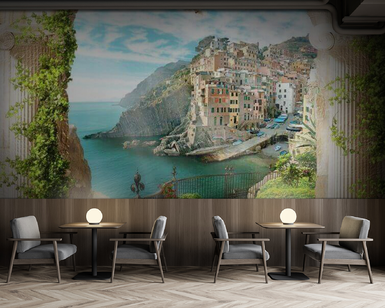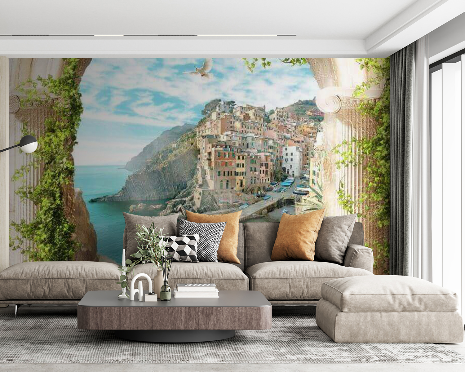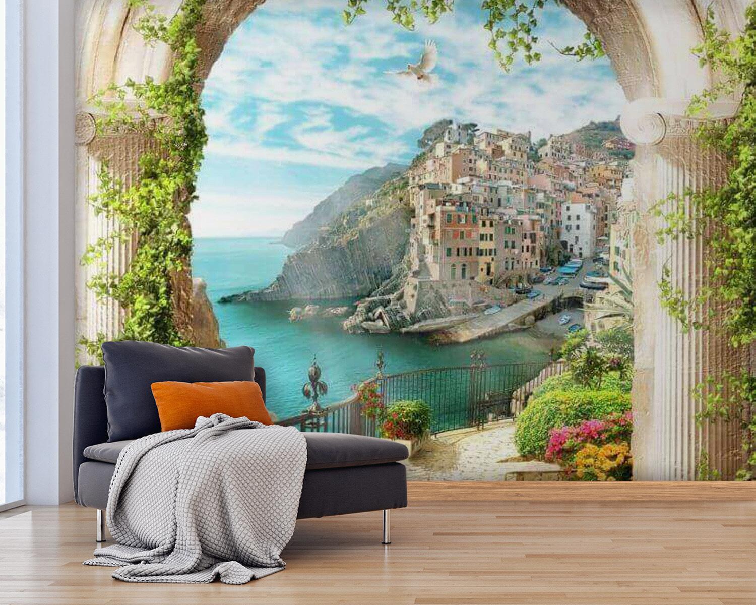 Verplaats je ruimte naar een dromerig kustverblijf met de muurschildering “Fotobehang Plant in a Pot”! Oh, het uitzicht – uitzicht op een charmant dorpje aan zee door een betoverende boog, gedrapeerd in weelderig groen. Stel je voor dat je ‘s ochtends aan je koffie nipt terwijl het zonlicht danst op het water… Het is net een mini-vakantie elke keer als je er naar kijkt!