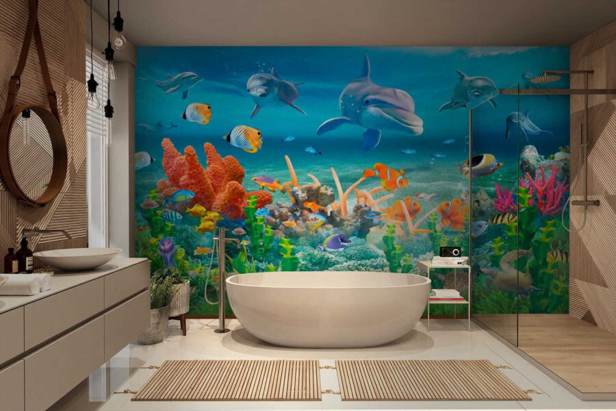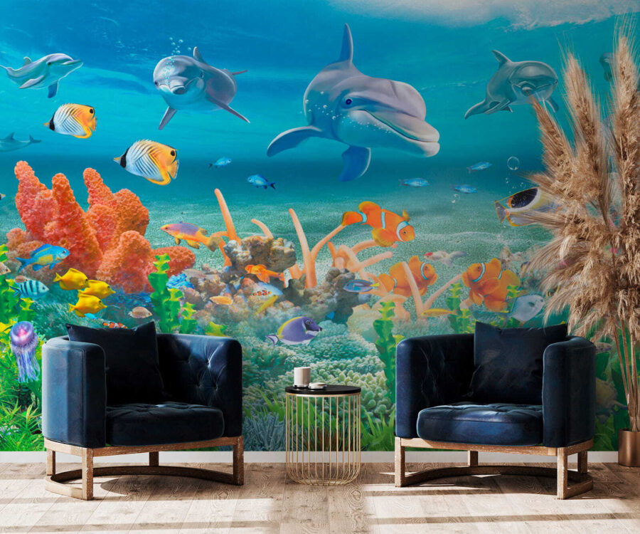 Stel je voor dat je elke ochtend je ogen opent met een uitbarsting van vrolijkheid – deze levendige muurschildering “Dolfijn zwemt in het water” kan precies dat doen! Perfect voor de kinderkamer of je eigenzinnige woonruimte, met speelse dolfijnen en kleurrijke zeevrienden. Het kunstwerk is zo levendig dat je bijna verwacht dat die vrolijke dolfijnen uit de muur springen! Het is alsof je een venster hebt op een onderwaterparadijs, zonder het zand in je schoenen. Deze muurschildering brengt een vleugje geluk aan zee en een vleugje eigenzinnigheid naar je kamer. Duik in een wereld vol verbeelding en zie de kamer oplichten met een glimlach en gegiechel. Het is niet alleen decoratie, het is een ervaring.