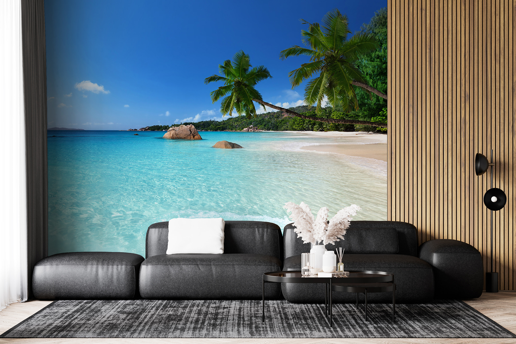 Tover die lege muur om in een tropisch uitje met deze prachtige muurschildering van palmbomen onder een stralend blauwe hemel bezaaid met pluizige wolken. Het is alsof je een stukje paradijs in huis haalt. Stel je voor dat je wakker wordt, koffie drinkt en je op een zandstrand waant in plaats van in je woonkamer. Deze muurschildering creëert moeiteloos een ontspannen sfeer, perfect voor een gezellige leeshoek of een levendige eethoek. Vrienden zouden wel eens kunnen vergeten dat ze binnen zijn – tot ze naar snacks grijpen! Omarm de beachy charme en laat de goede vibes binnenstromen.
