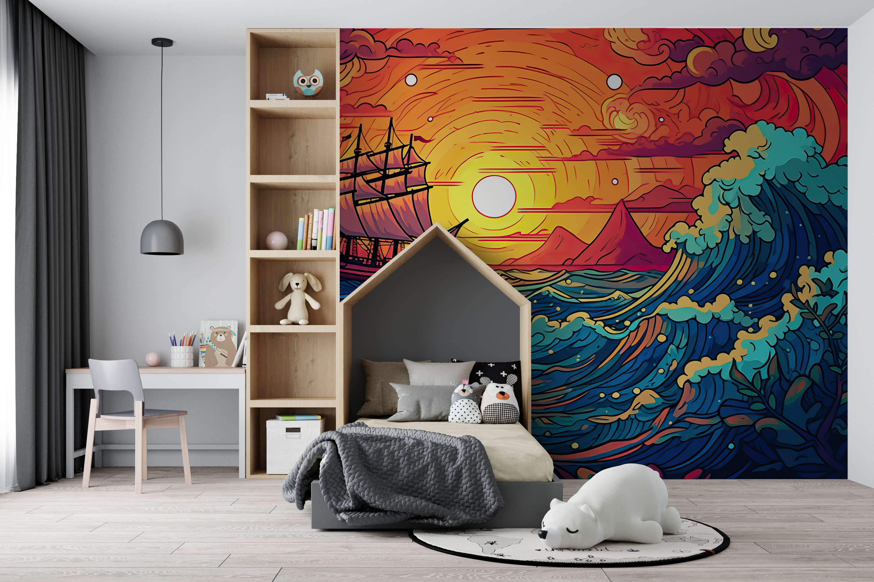 Stel je de zon voor die over de golven ondergaat met een majestueus schip dat voorbij vaart. Je kleintje kan dromen van piratenavonturen of gewoon genieten van het rustgevende tafereel aan zee. Maar deze muurschildering is niet alleen voor kinderen – hij past perfect in een kamer met een zee-thema of in elke andere ruimte die een vleugje natuurschoon nodig heeft.