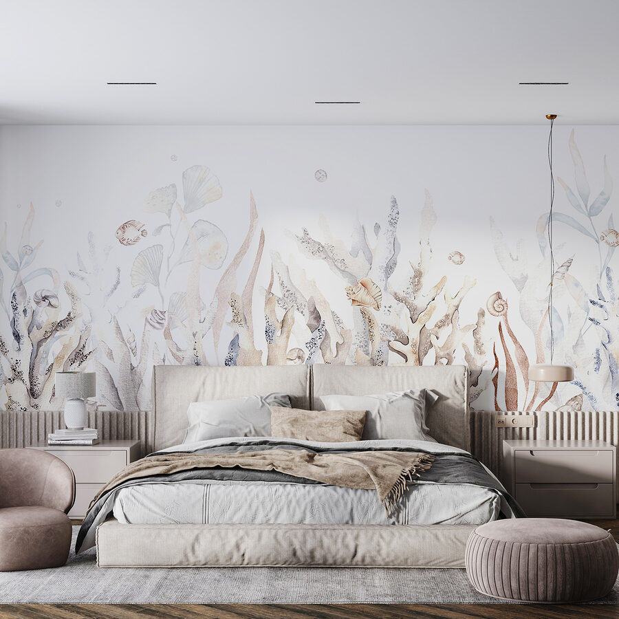 Stel je voor dat je je kamer binnenloopt en het gevoel hebt dat je net een betoverend onderwaterparadijs bent binnengestapt. De muurschildering “Underwater Garden with Shells and Fish” is alsof je een stukje oceaan in huis hebt. Met serene kleuren en delicate details heeft het een rustgevende sfeer die perfect is om tot rust te komen na een lange dag. Je kunt de koele zeebries bijna voelen en de zachte golven horen, nietwaar?
