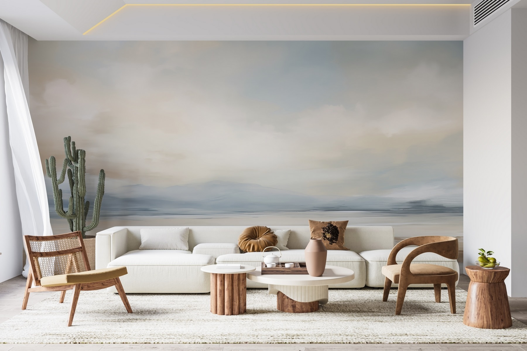 Transformeer je ruimte met deze serene muurschildering, “Landschap met water en wolken”. Stel je voor dat je een kamer binnenloopt waar rustgevende kleuren fluisteren en zachte wolken boven je hoofd drijven. Deze muurschildering neemt je mee naar een dromerige vakantie aan zee – perfect voor als je thuis niet dat uitzicht op de oceaan hebt. Stel je voor dat je aan je koffie nipt, naar dit weidse, vredige landschap staart en je stress voelt wegsmelten. Het is net een mini-vakantie elke dag! Ideaal voor een woonkamer of een gezellig hoekje, het nodigt uit tot ontspanning, een gesprek en misschien zelfs een dagdroom of twee. Wie zou dat niet willen?
