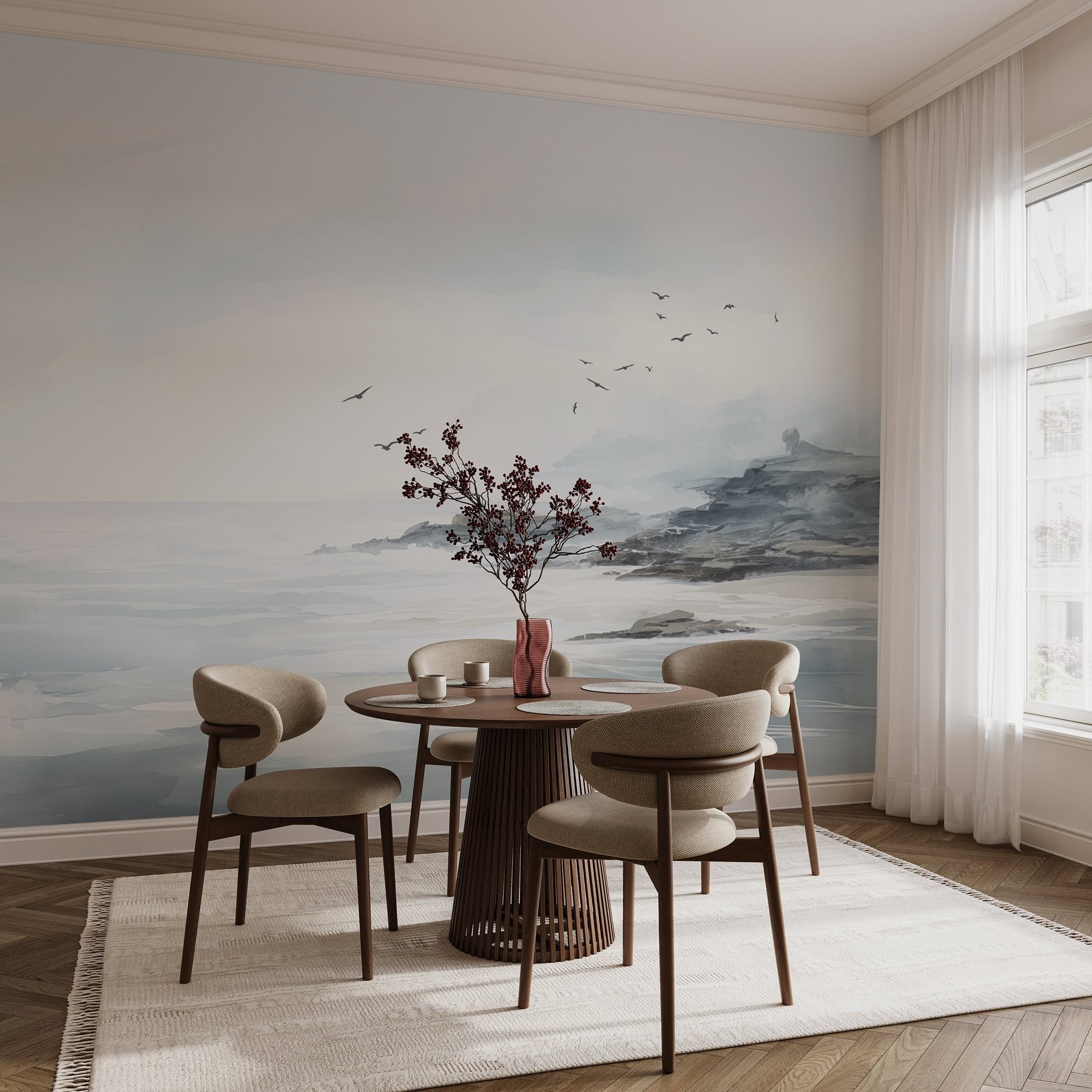 Transformeer elke kamer met deze betoverende muurschildering, “Vogels vliegen over een rotsachtig strand”. Stel je voor dat je wakker wordt met de zachte kleuren van de oceaan en die dromerige vogels die door de lucht vliegen. Het is net een mini-vakantie op je muur! De zachte kleuren creëren een rustgevende sfeer, perfect voor een chille woonruimte of een serene slaapkamer.