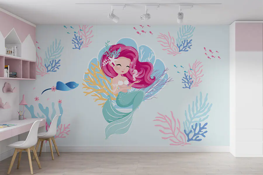 Duik in een wereld vol eigenzinnigheid met deze charmante muurschildering met een schattige cartoonzeemeermin en haar trouwe zeepaardje. Stel je voor: dit speelse tafereel tovert elke saaie muur om in een magische zee. Het levendige roze haar stroomt als oceaangolven, terwijl het kleurrijke koraal een vleugje leven toevoegt. Stel je voor dat deze muurschildering de slaapkamer van een kind opfleurt en hun verbeelding aanwakkert tijdens verhaaltjes voor het slapen gaan. Of misschien geeft het een leuke sfeer aan een speelse leeshoek. Elke blik op deze muurschildering kan een beetje vreugde brengen, waardoor dagdromen net iets echter aanvoelt. Perfect voor iedereen die een vleugje onderwater charme aan zijn of haar ruimte wil toevoegen!