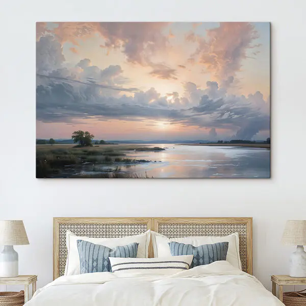 Canvas Schilderijen Zachte wolken boven een sereen landschap
