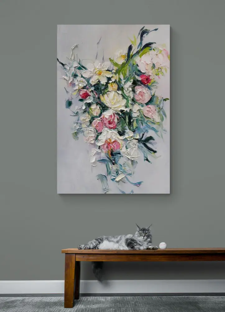 Hier is een canvasprint die een vleugje bloemencharme toevoegt aan je interieur. “Schilderij van bloemen op een wit oppervlak” is perfect voor iedereen die geen genoeg kan krijgen van kunst vol bloemen. Stel je eens voor: je zit in je woonkamer en bam, je wordt elke dag begroet door dit levendige boeket. Elke penseelstreek voelt als een bloemblaadje dat je bijna kunt aanraken. De kleuren zijn net levendig genoeg om de bloemen te laten knallen, maar ook zacht genoeg om naadloos in elk interieur te passen.