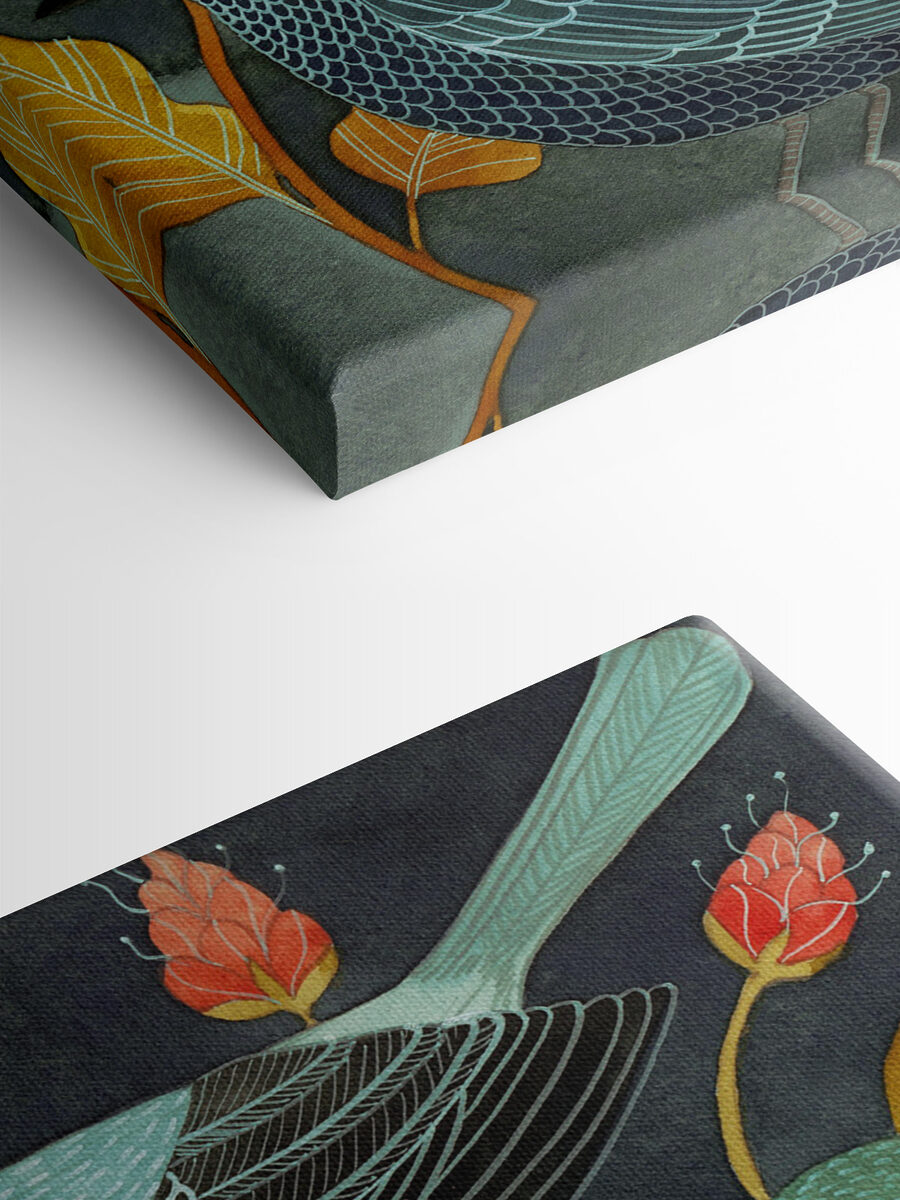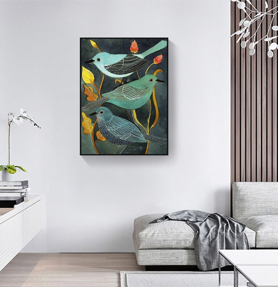 Perfect voor die plek waar je maar niet uit kwam wat je ermee moest doen – misschien boven je salontafel waar gasten samenkomen en kletsen. Het is eigenzinnig en toch elegant, en het vertelt als het ware zijn eigen verhaal. Deze vogels lijken hun eigen persoonlijkheid te hebben, alsof ze een geheimpje hebben. Kun je het zachte geritsel van de bladeren niet bijna horen, een zachte herinnering aan de schoonheid vlak voor onze ramen? Voegt een gezellige, serene sfeer toe aan je huis.