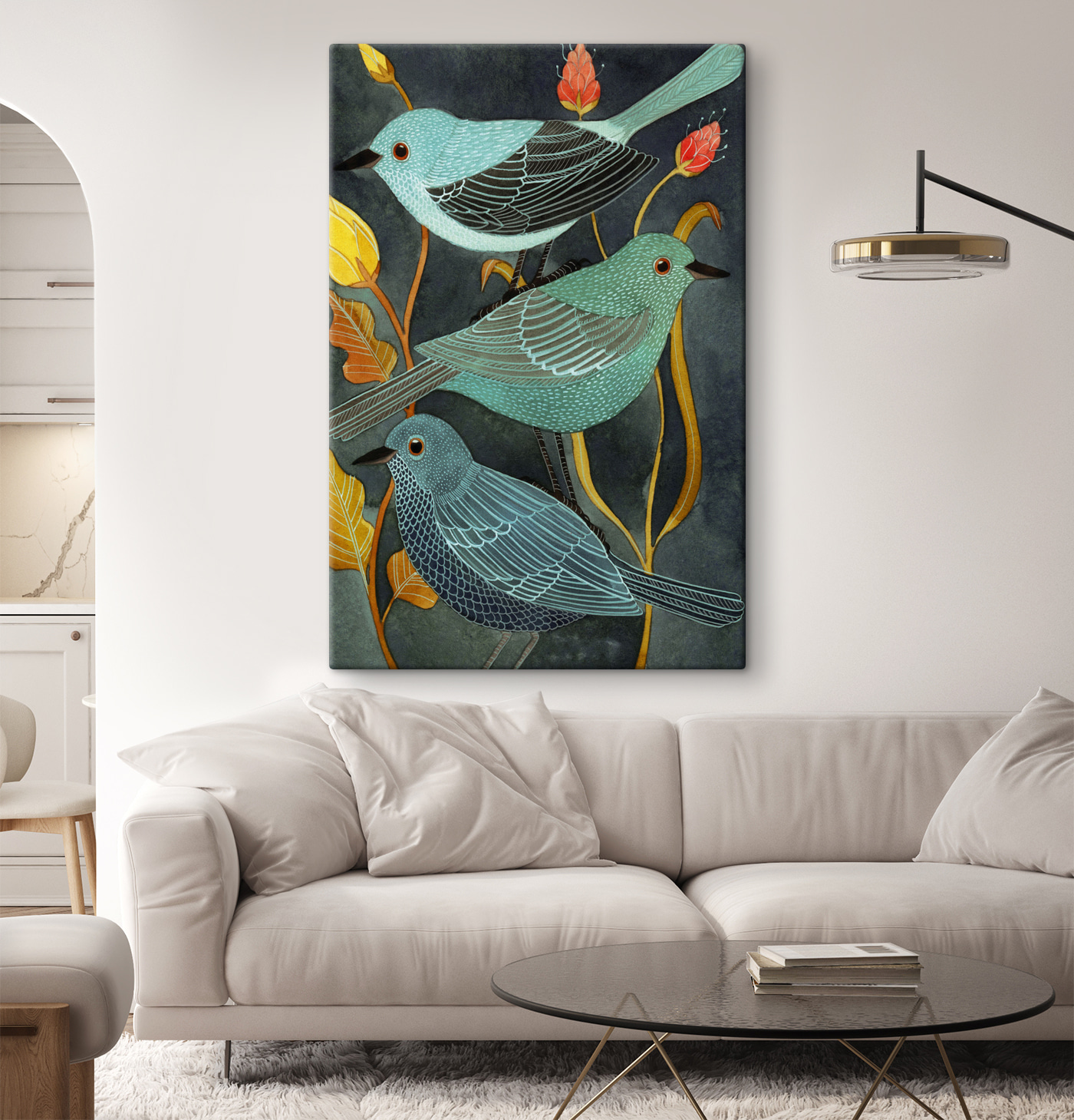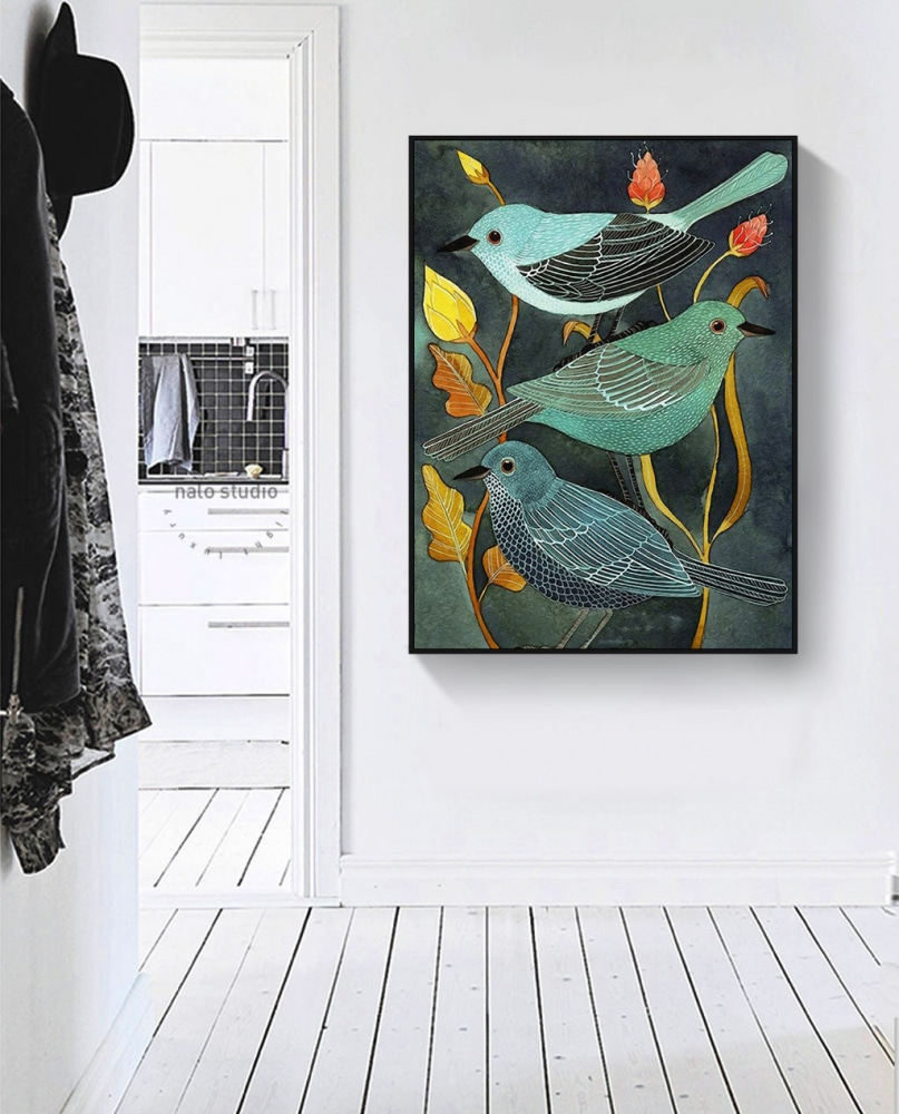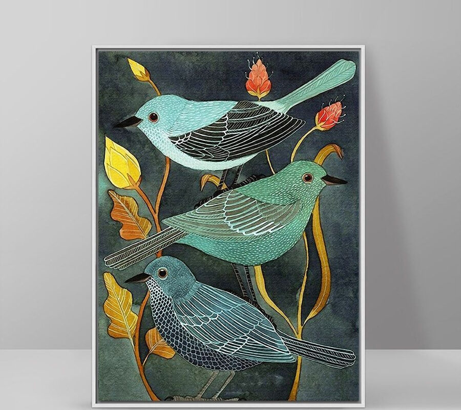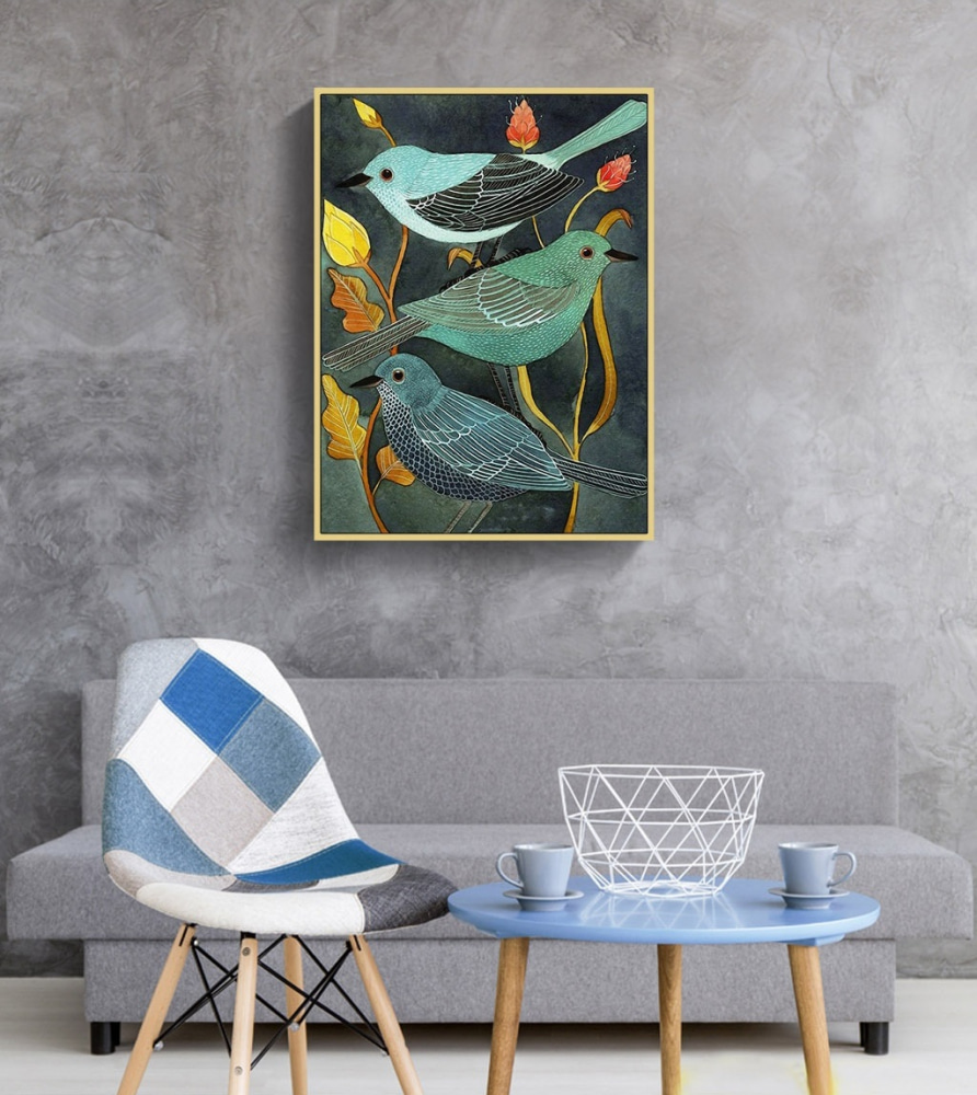 Perfect voor die plek waar je maar niet uit kwam wat je ermee moest doen – misschien boven je salontafel waar gasten samenkomen en kletsen. Het is eigenzinnig en toch elegant, en het vertelt als het ware zijn eigen verhaal. Deze vogels lijken hun eigen persoonlijkheid te hebben, alsof ze een geheimpje hebben. Kun je het zachte geritsel van de bladeren niet bijna horen, een zachte herinnering aan de schoonheid vlak voor onze ramen? Voegt een gezellige, serene sfeer toe aan je huis.