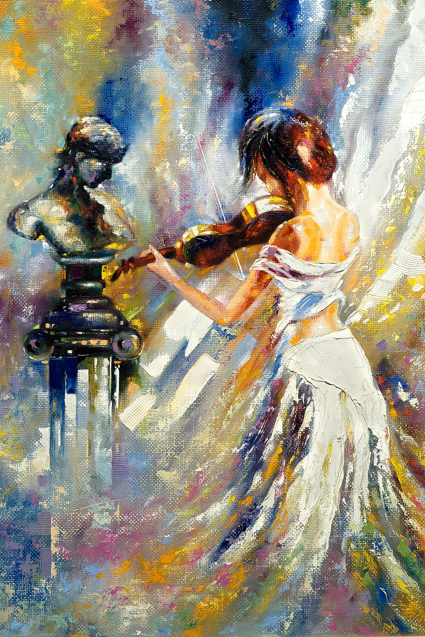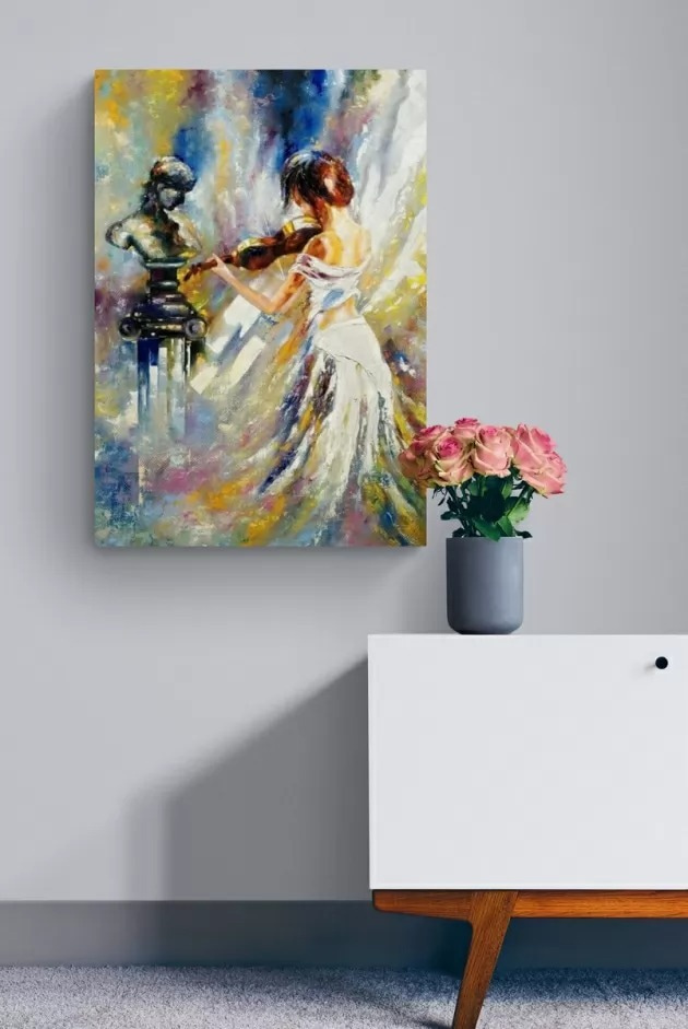 Deze canvasprint legt een betoverend moment vast – een vrouw met haar viool, verdwaald in een wereld van muziek en kleur. Je kunt de melodieën bijna horen dansen in de lucht, toch? De wervelende tinten creëren een dromerige achtergrond die levend aanvoelt, bijna alsof het schilderij ademt bij elke noot die ze speelt. Stel je voor dat dit werk in een gezellig hoekje van je huis hangt en uitnodigt tot warme gesprekken en dagdromen. Het is niet zomaar kunst; het geeft inspiratie en voegt een vleugje elegantie toe. Perfect voor wie de harmonie van creativiteit en schoonheid waardeert!