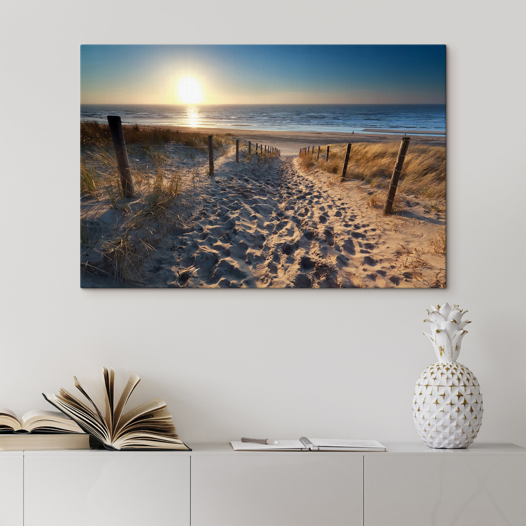 Stel je voor dat je over dit zandpad loopt, de zon die de horizon kust en in de eindeloze zee zinkt. “Path to the Beach’ is niet zomaar een afdruk op canvas, het is een mini-uitstapje aan je muur! Elke keer dat je ernaar kijkt, kun je de zachte golven bijna horen en die warme, zoute bries voelen. Perfect om een stukje natuur binnenshuis te brengen, ideaal voor woonkamers of serene slaapkamers. Of je nu dagdroomt van een strandpicknick of gewoon tot rust komt na een lange dag, dit stuk geeft de essentie van kustgeluk weer. Het is als een kleine herinnering dat het paradijs slechts een oogopslag verwijderd is!
