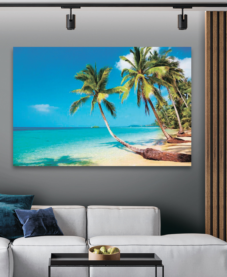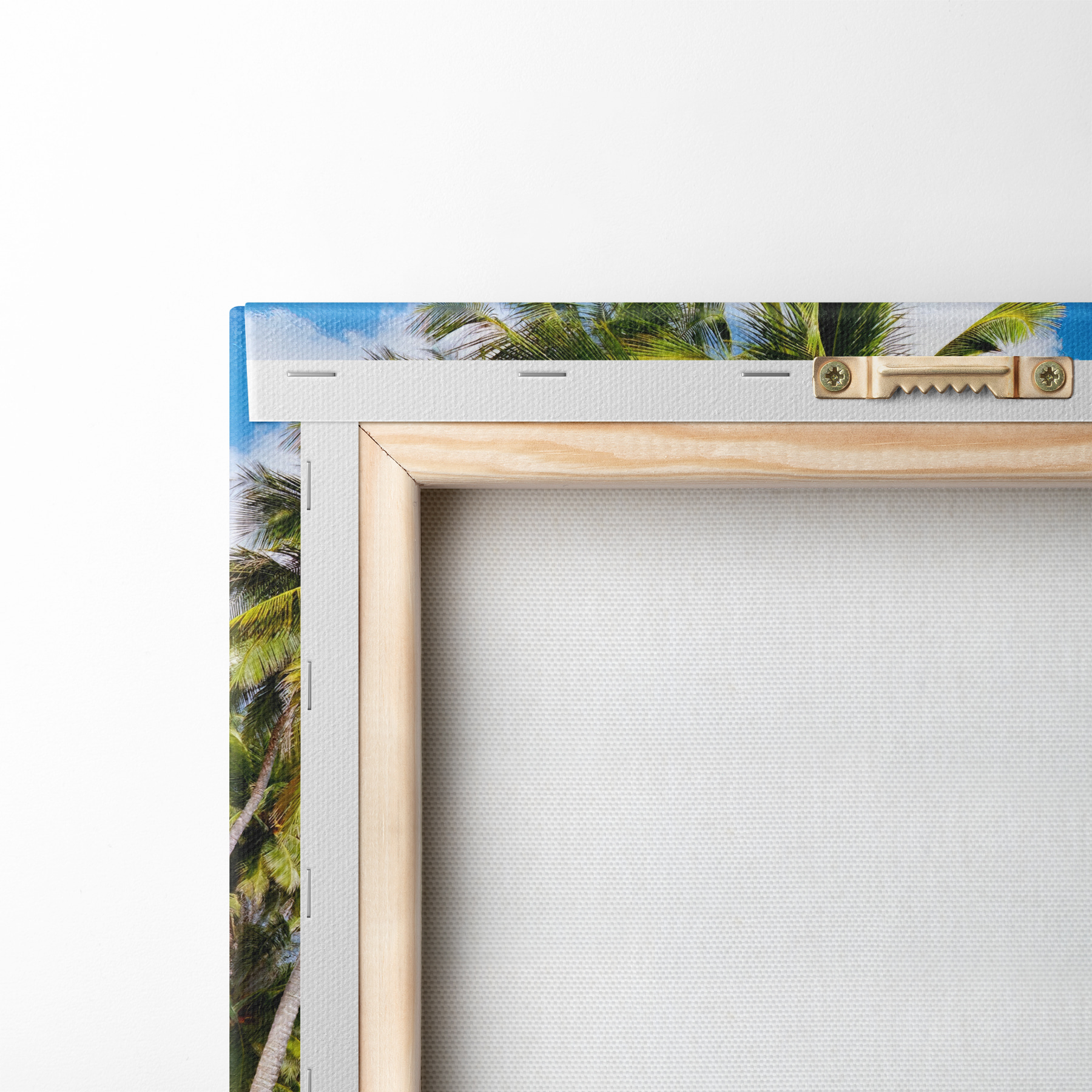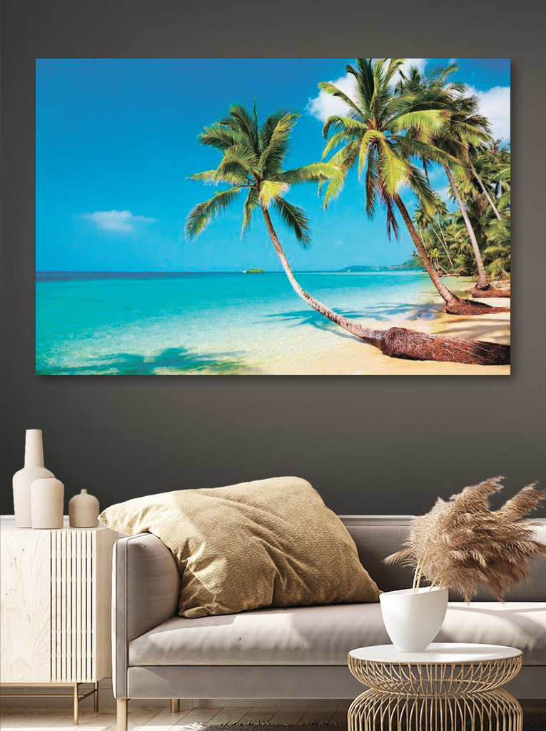 Stel je voor dat je je woonkamer binnenstapt en begroet wordt door het mooiste uitzicht van palmbomen die zachtjes over een ongerept strand wuiven. Deze canvasprint, met de toepasselijke naam “Palmbomen op een strand”, is als een persoonlijk stukje paradijs aan je muur. Perfect voor die sombere winterochtenden wanneer je een opkikkertje nodig hebt of gewoon wanneer je verlangt naar een dosis rust uit de natuur.