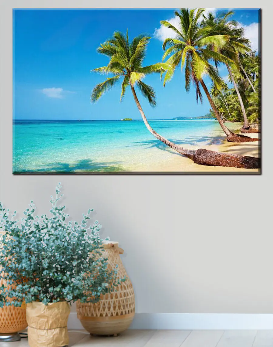 Stel je voor dat je je woonkamer binnenstapt en begroet wordt door het mooiste uitzicht van palmbomen die zachtjes over een ongerept strand wuiven. Deze canvasprint, met de toepasselijke naam “Palmbomen op een strand”, is als een persoonlijk stukje paradijs aan je muur. Perfect voor die sombere winterochtenden wanneer je een opkikkertje nodig hebt of gewoon wanneer je verlangt naar een dosis rust uit de natuur.