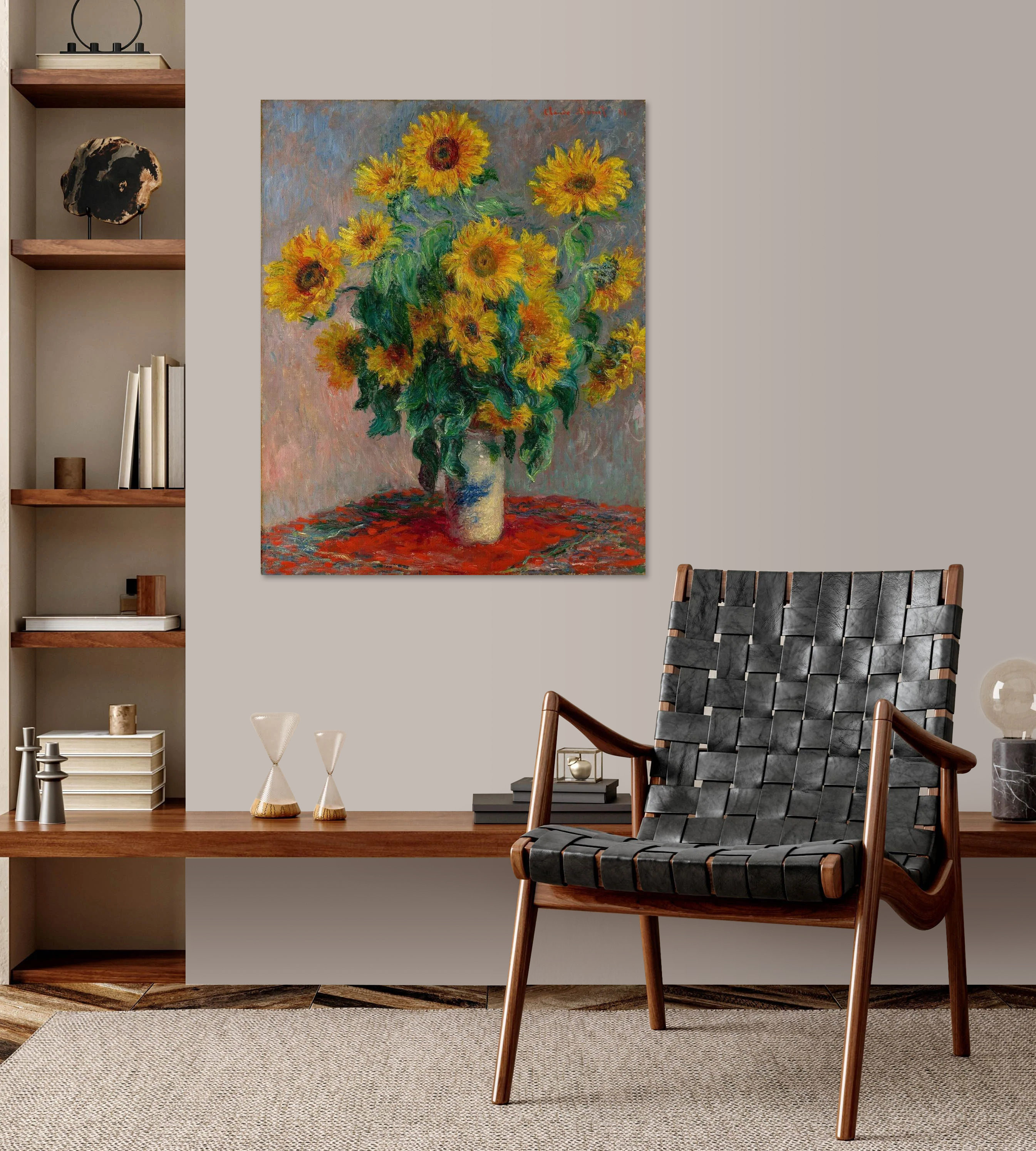 Fleur elke kamer op met deze prachtige canvasprint met een boeket zonnebloemen in een vaas. Deze vrolijke bloemen, boordevol levendig geel en weelderig groen, brengen een vleugje charme van de natuur in huis. Stel je voor dat dit stuk in een gezellig hoekje hangt, uitnodigt tot warme gesprekken of gewoon een moment van rust biedt te midden van een drukke dag. Het is alsof je het hele jaar door een beetje zomerzon hebt. Perfect voor iedereen die van bloemen houdt of een vleugje kleur wil toevoegen, dit kunstwerk zal zeker vrolijkheid oproepen en misschien zelfs een glimlach of twee. Wie zou zich niet vrolijk voelen met zulke mooie metgezellen aan de muur?