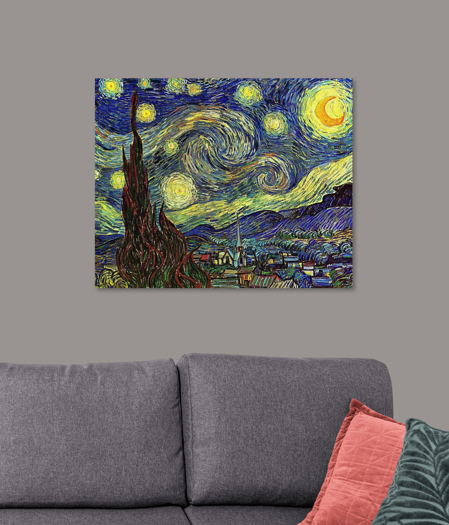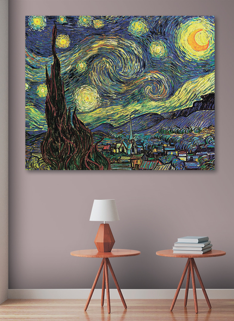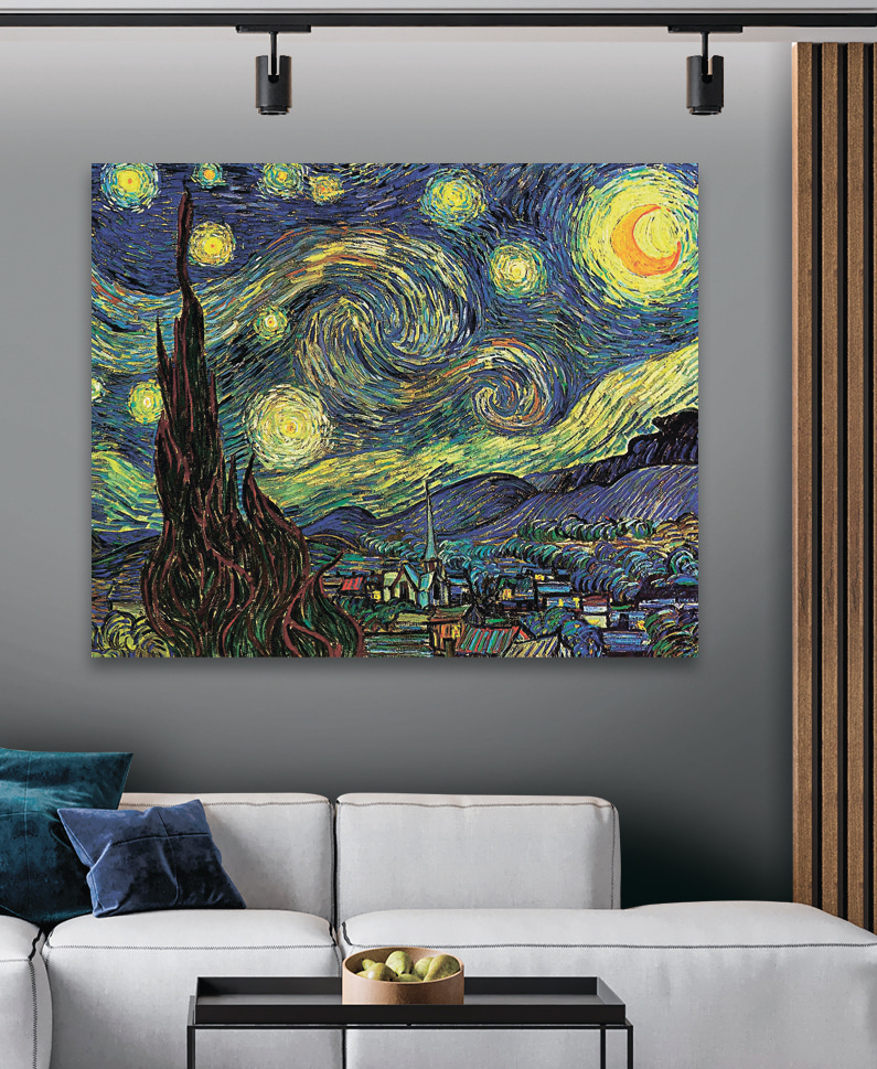 Stel je eens gezellige avonden voor onder dit meesterwerk, eventueel met een kopje iets warms erbij. Het is meteen een gespreksstarter-“Kijk eens naar die levendige sterren! Was de kunstenaar stiekem deels astronoom?”. Of je nu je woonkamer opknapt of charme toevoegt aan een slaapkamer, deze print heeft die wow-factor. Je kunt je gemakkelijk verliezen in de betoverende sfeer. Perfect om je kamer wat hemelse sfeer te geven!