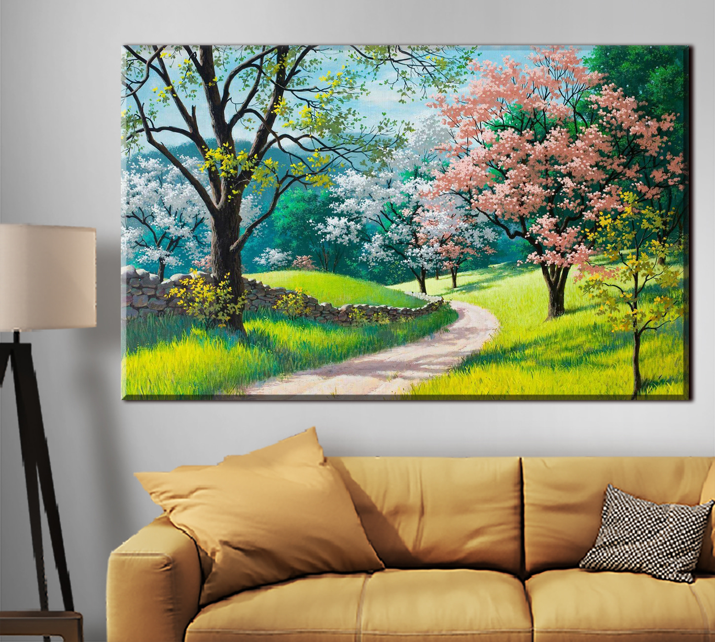 Stel je voor dat je je kamer binnenloopt en begroet wordt door deze weelderige, dromerige canvasprint-bomen vol roze en witte bloesems. Het is alsof je een sprookjesboek binnenstapt in je eigen huis. Het heeft iets bijna magisch, alsof de lucht gevuld is met de geur van de lente en het geluid van tjilpende vogels, ook al is het hartje winter. Het kronkelende pad nodigt uit tot een ontspannen wandeling, misschien verdwalen in gedachten van zonnige dagen en warme briesjes. Het is een heerlijke ontsnapping, perfect voor iedereen die houdt van een vleugje natuur en eigenzinnigheid in hun inrichting. Verander elke saaie muur in een levendig buitenscène; het is echt een geluksbrenger.