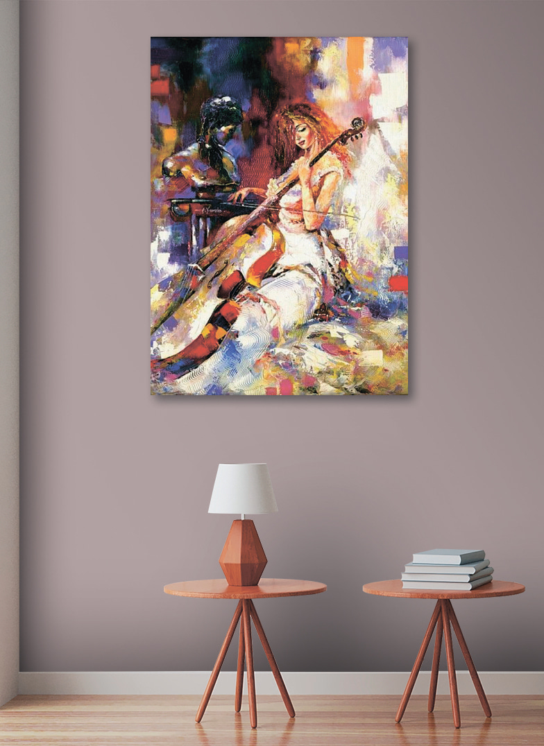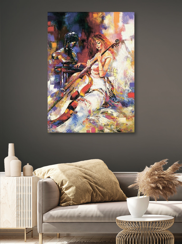 Hallo, vriend! Wil je dat het lijkt alsof je ruimte je een elegante serenade brengt? Kijk dan eens naar deze levendige canvasprint van een vrouw die viool speelt. Het heeft allemaal prachtige, levendige kleuren waardoor je de muziek bijna hoort – een soort symfonie door kunst. Of je nu een muziekliefhebber bent of gewoon iemand die houdt van unieke decoraties, dit stuk voegt een vleugje rust en schoonheid toe aan elke kamer. Stel je voor dat je dit in je woonkamer hebt staan: instant klasse. Bovendien is het een fantastische gespreksstarter. Perfect om je kamer op te vrolijken met een vleugje cultuur!
