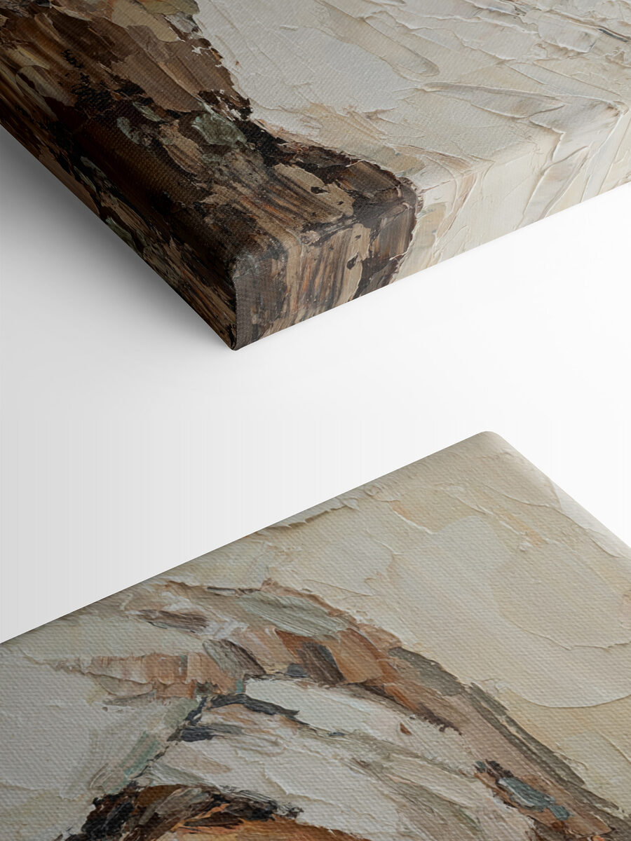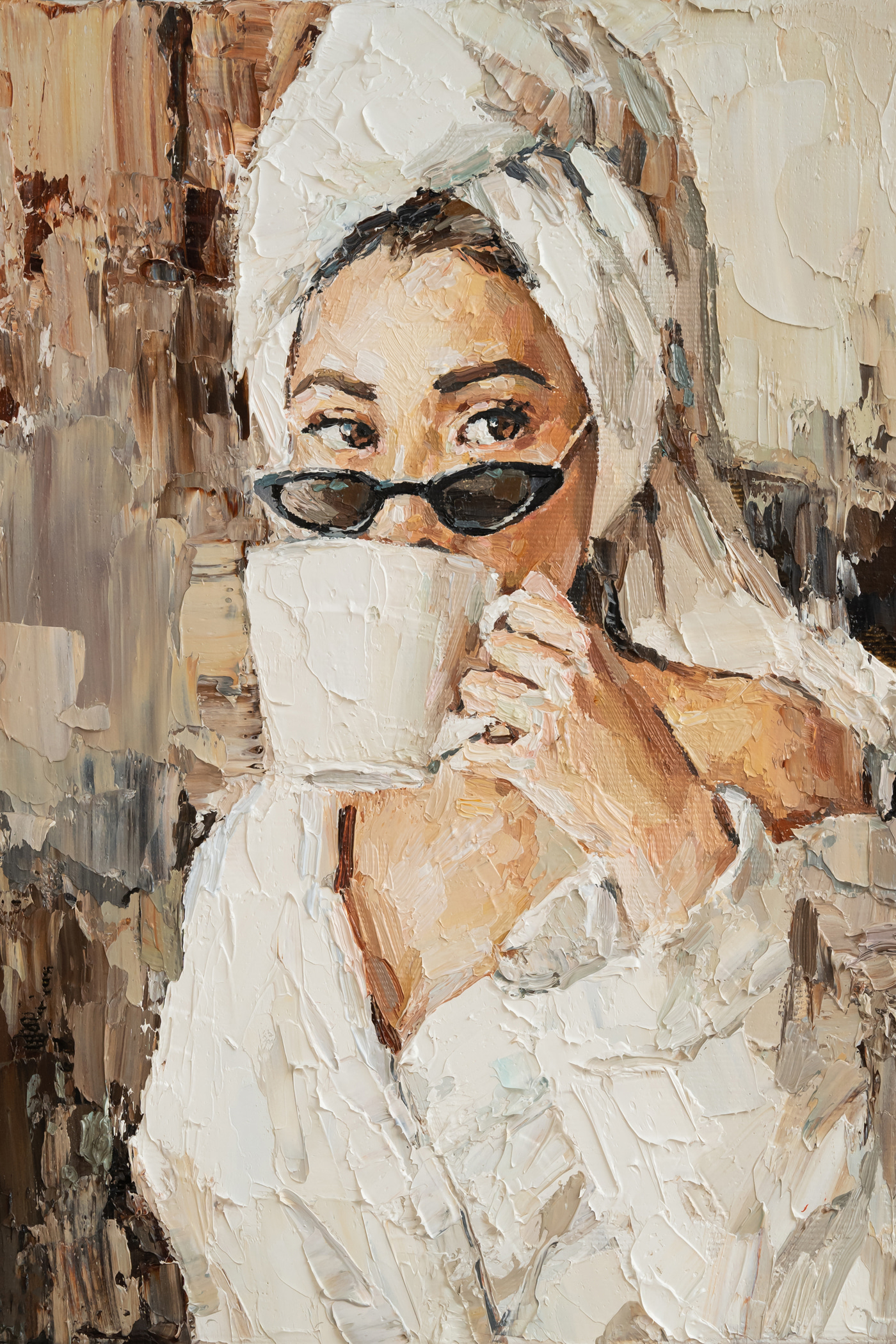 Stel je dit voor: een gezellig hoekje in je huis, misschien is het de keuken of dat ene plekje bij het raam. Stel je nu voor dat je deze canvasprint ophangt met daarop een vrouw die geniet van haar kopje vreugde. Met een handdoek op haar hoofd en een zonnebril die schreeuwt ‘zo ben ik wakker geworden’, heeft ze die moeiteloze chique uitstraling. De warme kleuren gaan mooi samen, roepen een gevoel van rust op en nodigen je uit om even op adem te komen. Perfect voor een koffiehoekje of een ruimte die een vleugje elegantie en plezier nodig heeft, spreekt dit stuk tot de rustige momenten die we allemaal koesteren. Of het nu koffie of thee is, dit kunstwerk nodigt uit om even te pauzeren, waardoor het een mooie metgezel is in het dagelijks leven.