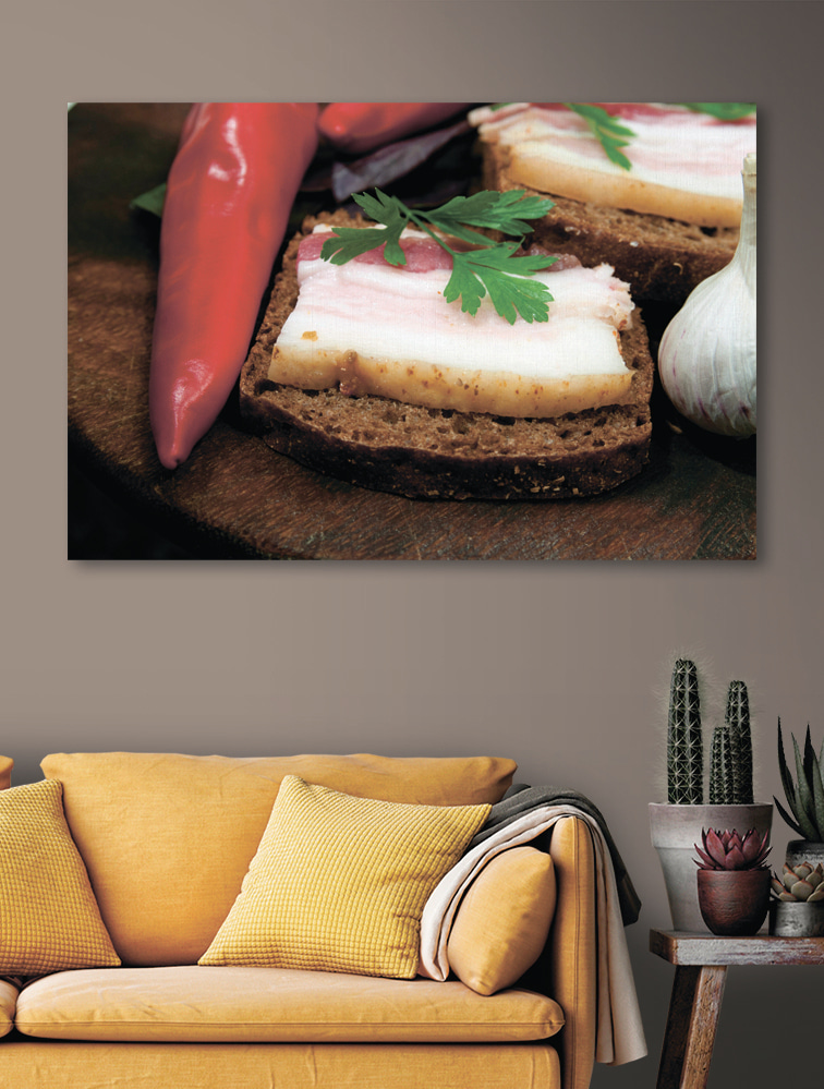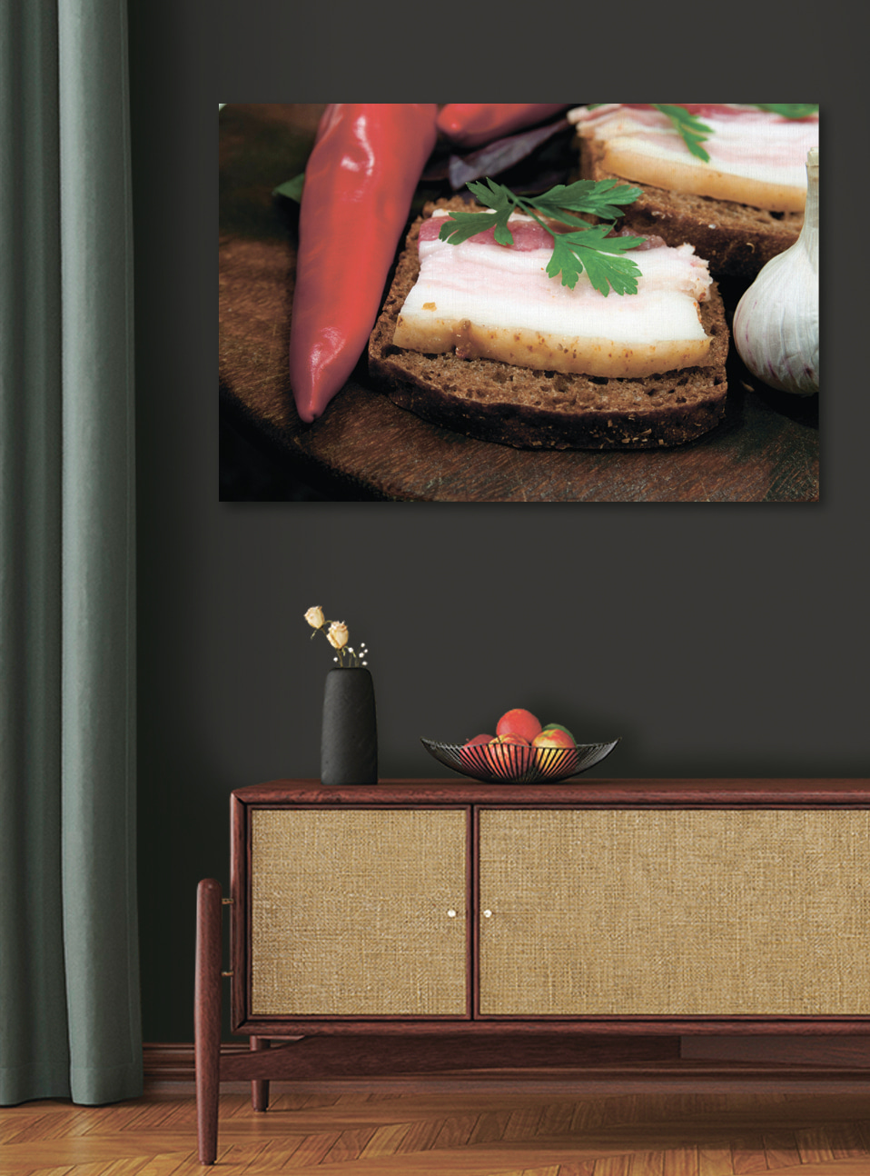 Deze charmante en gezellige canvasprint “Eenvoudige snack met brood en spek” is een lust voor het oog. De print is perfect voor een keuken of eetkamer en geeft de warmte van huiselijke snacks weer – denk aan donker roggebrood met daarop hartige bacon, een takje verse peterselie en een vleugje knoflook. Die rijke, aardse tinten? Anders dan anders.