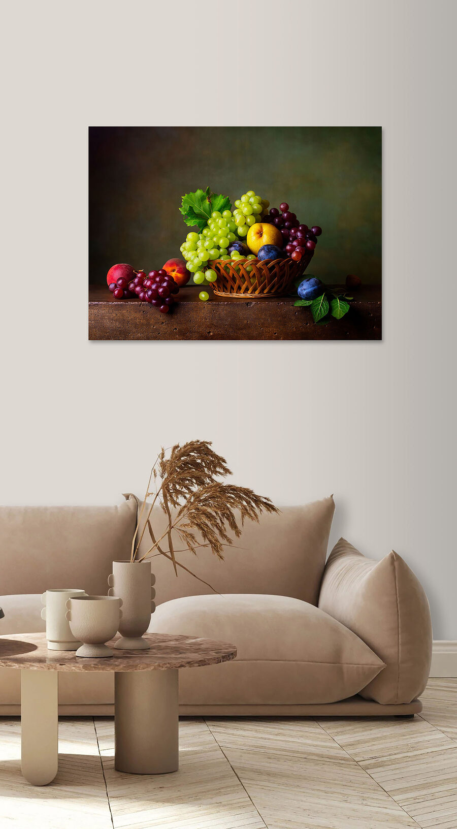 Fleur je kamer op met deze levendige canvasprint, “Fruitmand op tafel”. Stel je voor dat je een kamer binnenloopt waar dit levendige stuk je begroet, boordevol verse druiven, sappige perziken en glanzende pruimen. Het is net een minimarkt aan je muur, die je uitnodigt om na te denken over een luie picknick in de namiddag of misschien gewoon een verfrissend tussendoortje. De warme kleuren voegen een gezellig tintje toe, perfect voor keukens of eethoeken. Vrienden vragen je misschien of je een fruitbedrijfje bent begonnen – glimlach gewoon en laat de kunst spreken! Het is niet alleen decor; het is een herinnering om te genieten van de zoetheid van het leven.