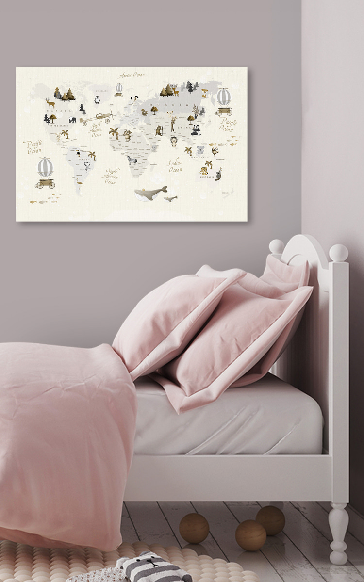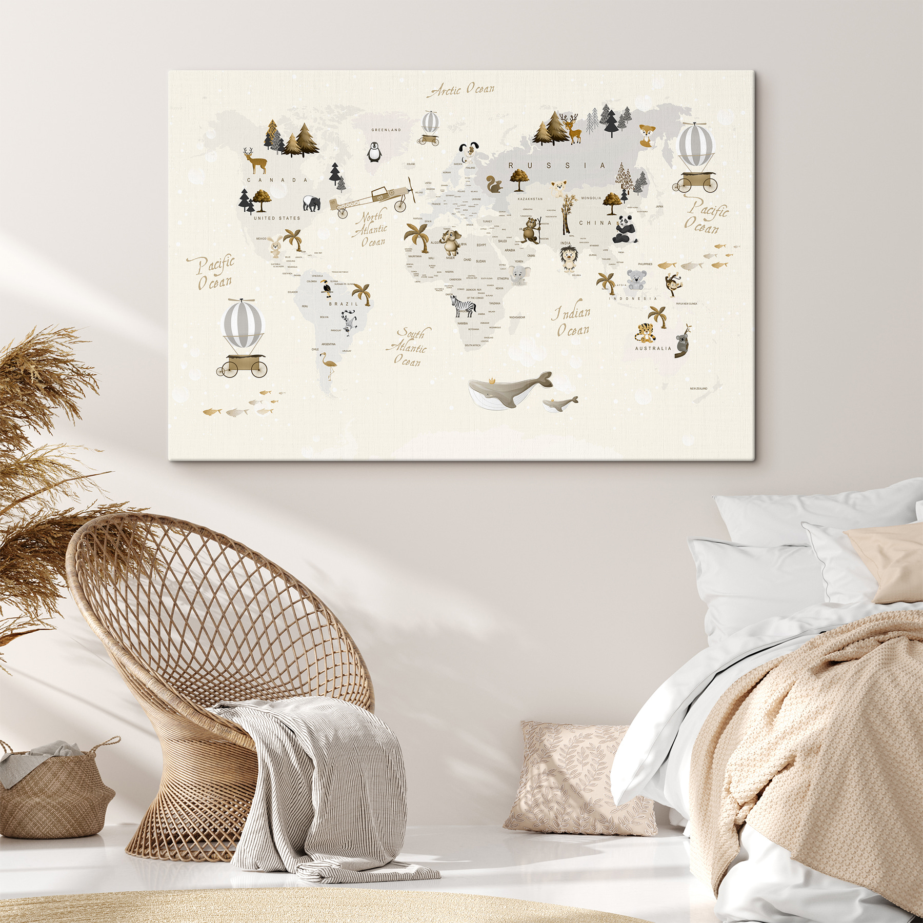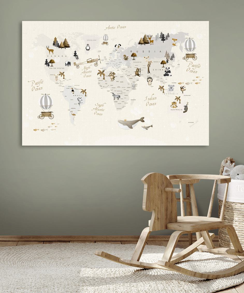 Hallo daar! Bekijk deze schattige canvasprint “Wereldkaart met dieren” – perfect om een speelse sfeer toe te voegen aan een kinderkamer. Het is net een leuke, kunstzinnige aardrijkskundeles met een knallend karakter. Stel je voor dat je kleintje zijn vingers over de continenten laat gaan en ontdekt waar pinguïns uithangen of waar leeuwen brullen.