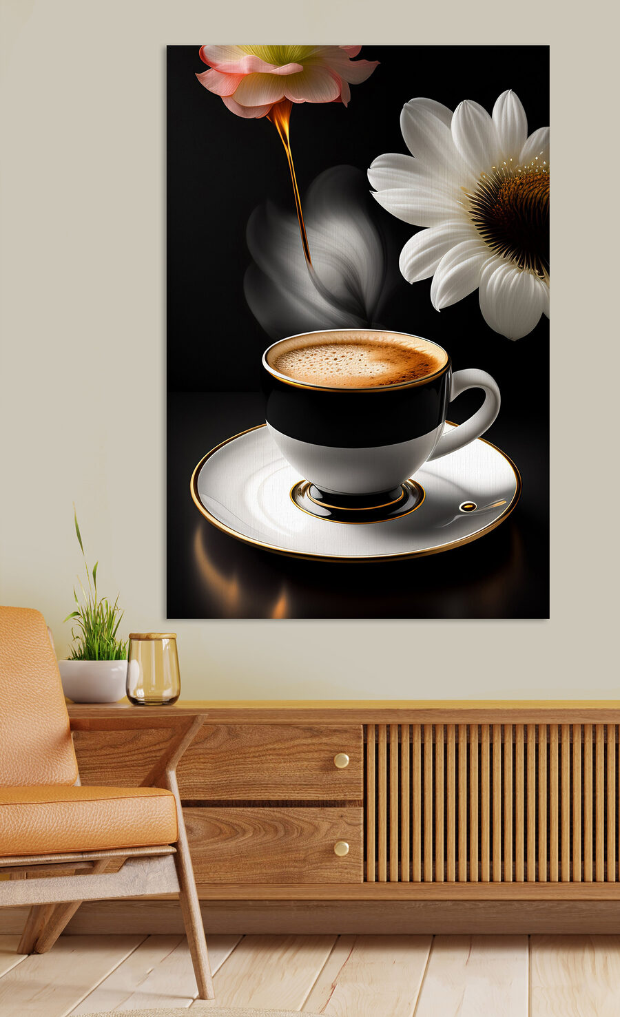 Stel je voor dat je je dag begint met een rijke, aromatische espresso, waarvan de warmte de kamer vult, terwijl erboven delicate bloemen dwarrelen. Dat is de sfeer van deze “Floral Aroma Swirling Above Espresso” canvasprint. Perfect voor je keuken of koffiehoekje! Het grillige ontwerp mengt rijke koffietinten met zachte bloemen en voegt een gezellige, uitnodigende sfeer toe. Kun je het niet ruiken? Bedenk hoe sereen je ochtend kan zijn, nippend aan je kopje koffie, met een canvas vol charme en geurherinneringen in de buurt.