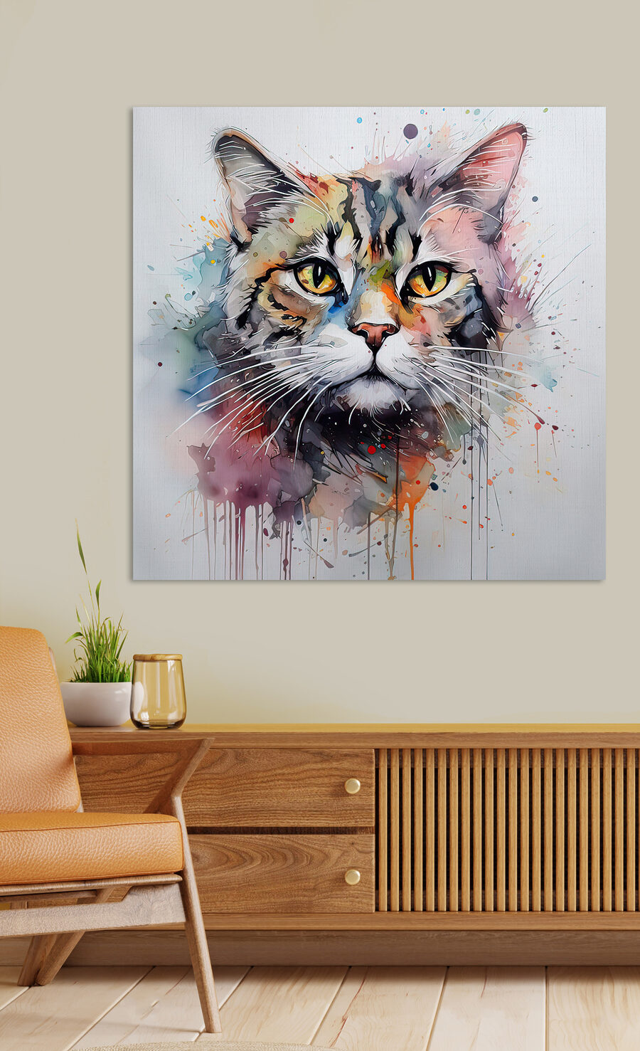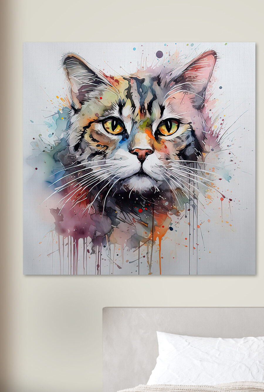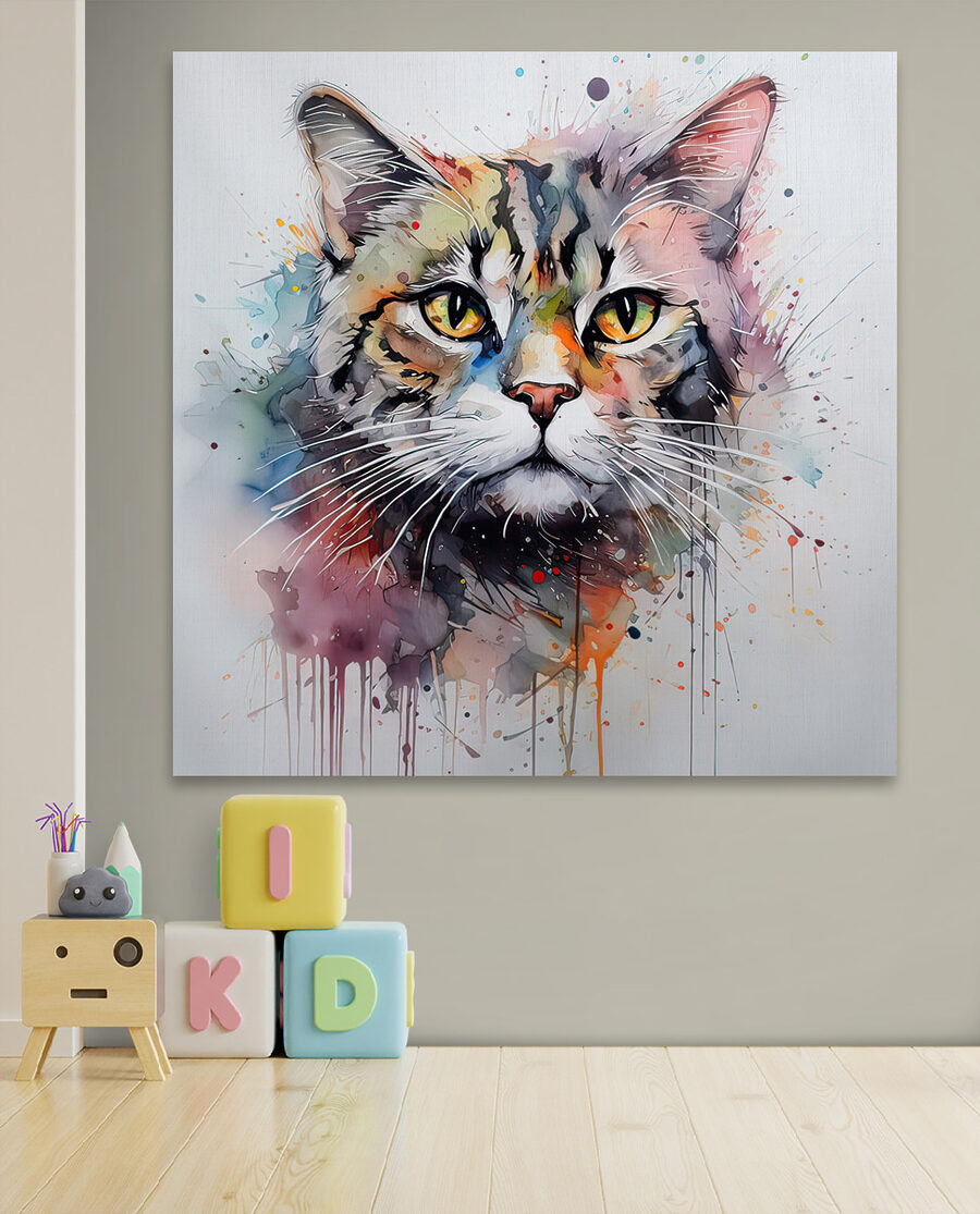 Dit levendige canvas van een kat is precies het vleugje eigenzinnigheid en kleur waar elke kamer naar hunkert. Stel je deze speelse kat voor die sierlijk over je kamer waakt en een vleugje mysterie en charme toevoegt. De levendige aquarelstijl lijkt zo van de muur af te springen – bijna alsof hij door je verbeelding sluipt. Misschien staar je jezelf wel in die zielvolle ogen en vraag je je af wat er in die katachtige geest omgaat. Perfect voor zowel dierenliefhebbers als kunstliefhebbers, het is een perfecte gespreksstarter.