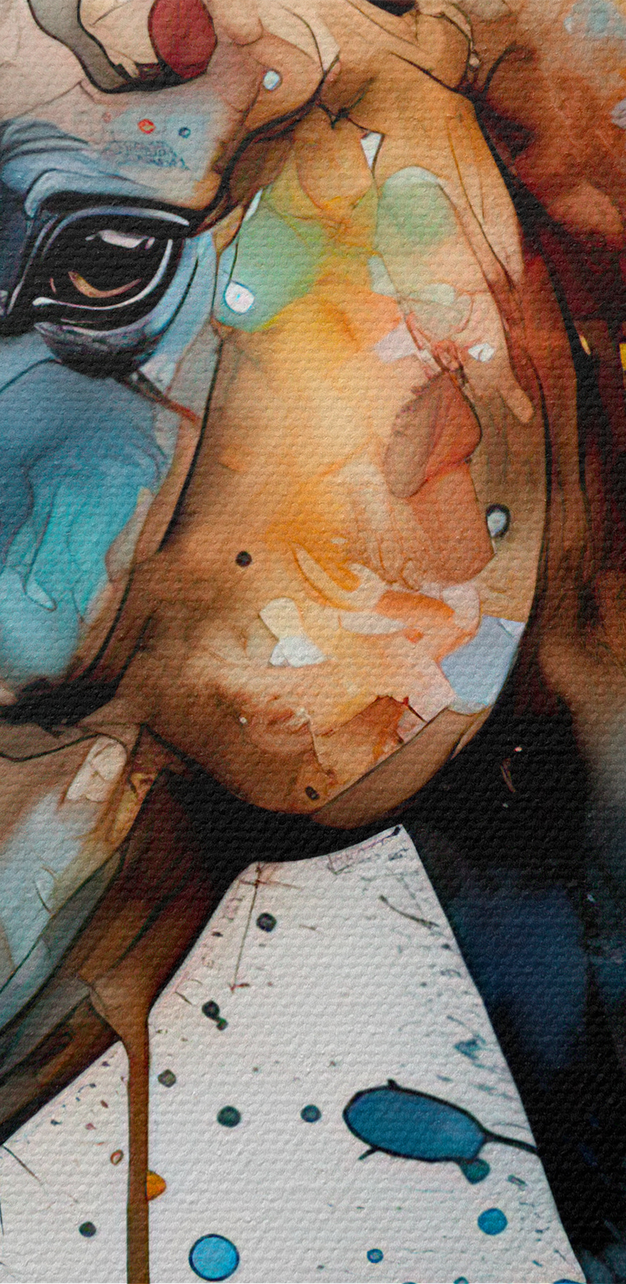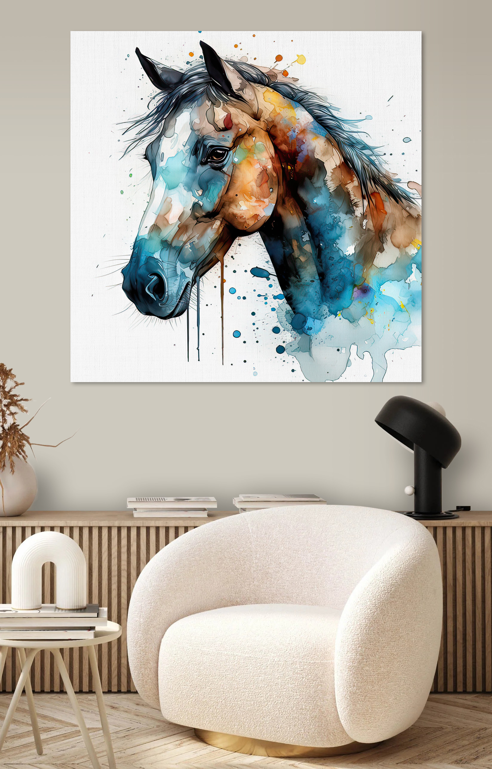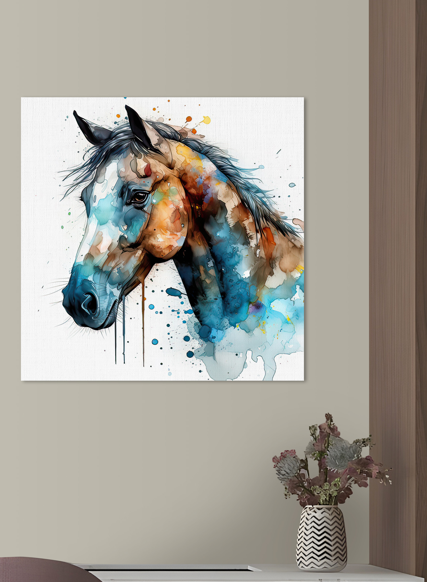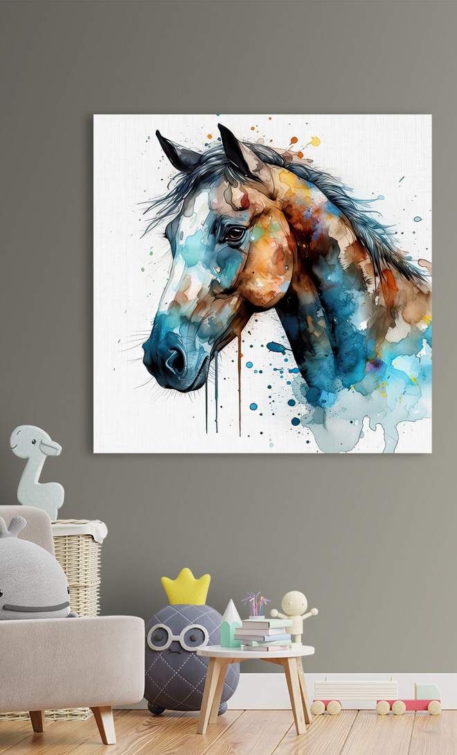 Transformeer elke ruimte met deze levendige canvasprint van een paard, bespat in een werveling van kleuren die lijken te dansen op het doek. Stel je voor dat je langsloopt en dat je elke keer dat je ogen op deze artistieke schoonheid vallen een uitbarsting van vreugde voelt. Het is alsof het paard op het punt staat om van de muur af te galopperen en een gevoel van leven en energie in je kamer brengt. Perfect voor paardenliefhebbers of iedereen die een vleugje wilde charme aan zijn interieur wil toevoegen. Hang het in je woonkamer en kijk hoe gasten even stilstaan, glimlachen en misschien zelfs een paardenverhaal of twee delen. Het is meer dan kunst; het is een gespreksstarter, een sfeermaker en een vleugje inspiratie voor elke dag.