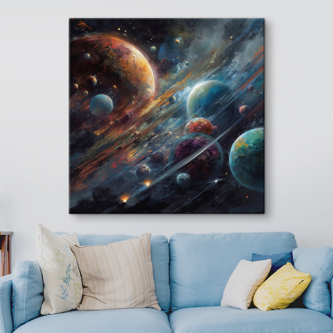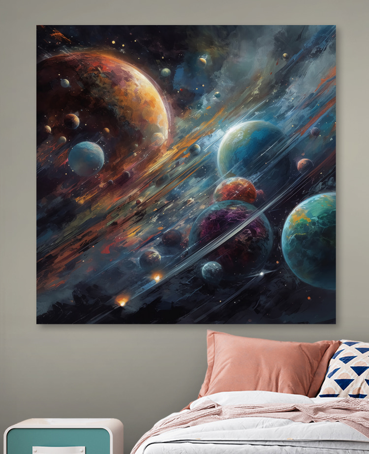 Stel je voor dat je een kosmisch carnaval binnenstapt, gewoon bij je in de woonkamer. “Vibrant Planets in Cosmic Dance” vangt de magie van de ruimte. Serieus, het is alsof je je eigen persoonlijke universum aan de muur hebt. Perfect voor kinderkamers of waar je maar een vleugje kleur en verwondering wilt. De wervelende planeten en sterrenhemel – absoluut betoverend!