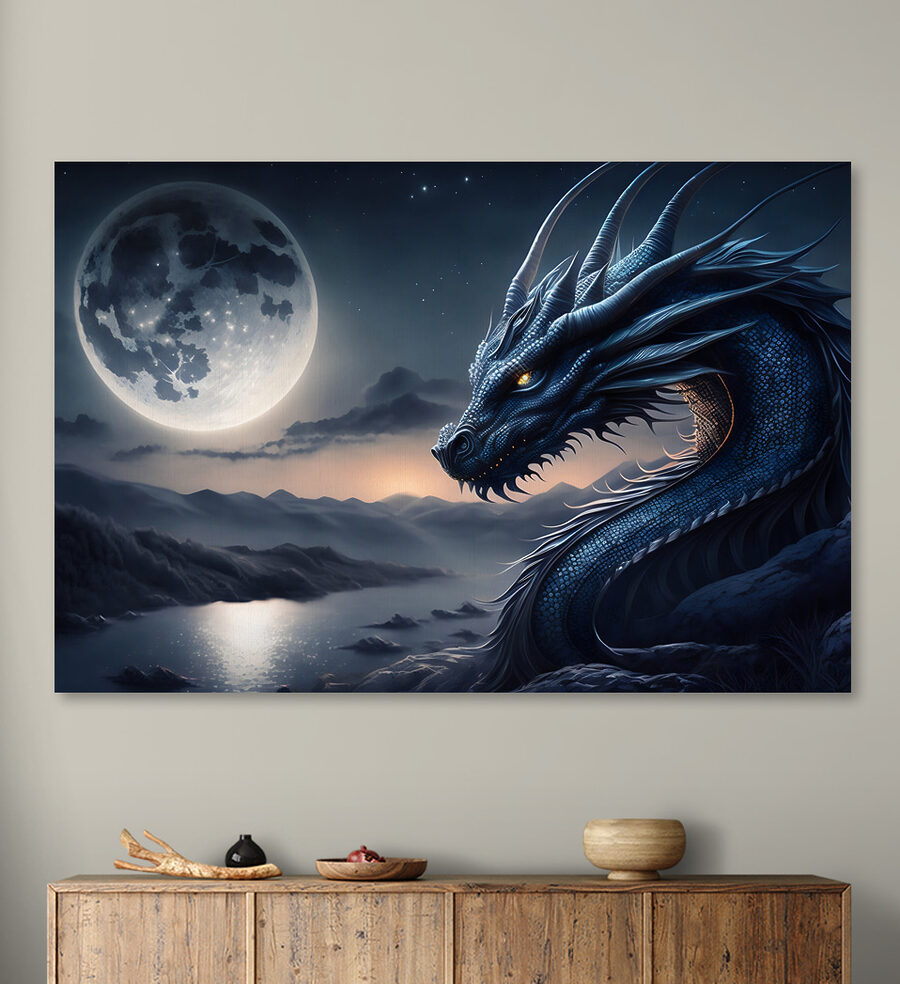 Tover elke kamer om in een grillig avonturengebied met deze canvasprint met een prachtige blauwe draak, compleet met majestueuze horens en een betoverende achtergrond van de maan. Stel je voor: je kind dat zijn kamer binnenloopt en zijn ogen ziet oplichten bij het zien van dit woeste maar vriendelijke wezen. Het is niet alleen kunst; het is de vonk van verbeelding, perfect om te dagdromen over queesten en betoverde landen. Dit levendige stuk nodigt uit tot gedachten aan magische nachten en spannende verhalen. Het is een gespreksstarter en laten we eerlijk zijn, wie wil er nou geen draak die een oogje in het zeil houdt? Perfect voor de kleine ontdekkingsreizigers in hart en nieren!