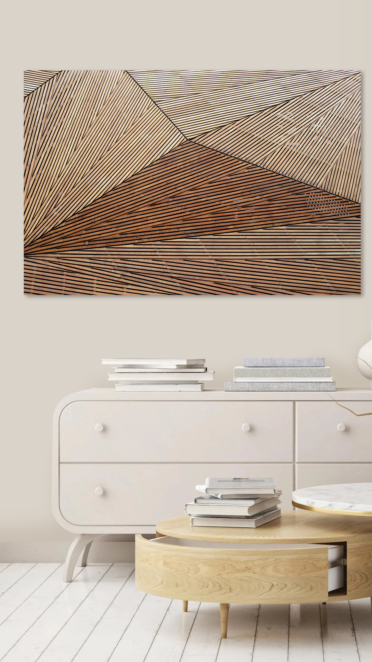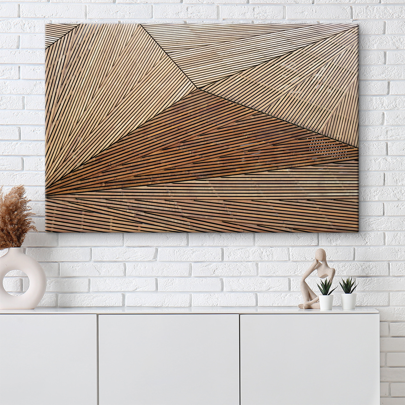 Stel je voor dat je je woonkamer binnenloopt en dit prachtige canvas aan je muur ziet hangen. “Geometrisch houten patroon met lijnen is als een moderne marvel, opvallend, gedurfd en moeiteloos chique. Perfect voor iedereen die houdt van een mix van architectuur en boho-esthetiek. Stel je houten balken voor die samenkomen in een dans van lijnen en een sfeer creëren die zowel rustgevend als intrigerend is. Het is als een conversatie starter die mensen laat zeggen, “Whoa, dat is cool!”. Bovendien past het in bijna elke stijl, of je nu gaat voor een gezellig hoekje of een stijlvolle loftlook. Het is verbazingwekkend hoe het toevoegen van dit ene stuk je ruimte tot leven kan brengen.