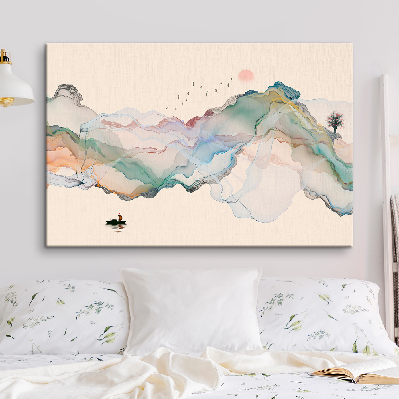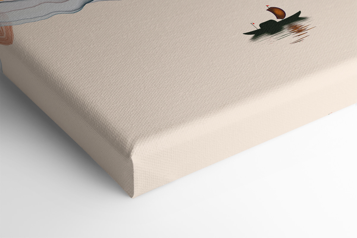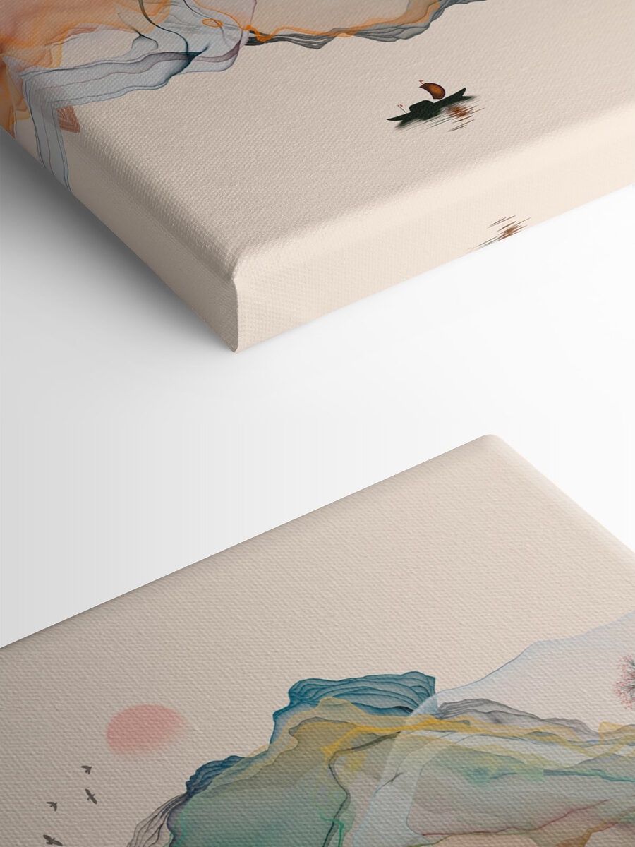 Stel je voor dat je naar deze prachtige canvasprint van een eenzame boot met vlaggen staart, sereen drijvend tegen een achtergrond van zachte, stromende bergen en een zachte zonsopgang. Het is als een visueel slaapliedje, kalmerend en betoverend. De kleuren? Het is een poëtische mix van pasteltinten die in elkaar overvloeien – blauw, roze en groen die in perfecte harmonie samengaan. Je zou je dit werk zo voor kunnen stellen aan de muur van een woonkamer, met een dromerige, bijna grillige sfeer waardoor gasten even stilstaan en een tweede blik werpen. Het is een beetje escapisme aan de muur – een herinnering dat er een hele wereld van rust en mysterie bestaat. Perfect voor natuurliefhebbers en iedereen die houdt van unieke, prachtige kunst met een verhaal.