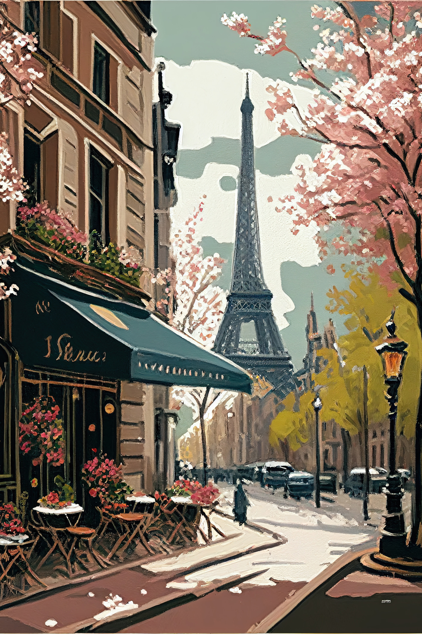 Verplaats jezelf naar een dromerig straatcafé met deze charmante canvasprint. Stel je de warmte voor van vers gezette koffie en het zachte geroezemoes van gesprekken, allemaal terwijl de iconische toren hoog op de achtergrond staat. De pastelkleurige bloemen en schilderachtige tafeltjes nodigen uit tot lachen en een praatje met vrienden of misschien gewoon een rustig moment voor jezelf. Elke blik op dit kunstwerk kan je meevoeren naar een zonnige dag slenteren door de stad, waarbij je die onmiskenbare buzz voelt. Perfect voor elke muur, het is alsof je een stukje Parijs thuis hebt!