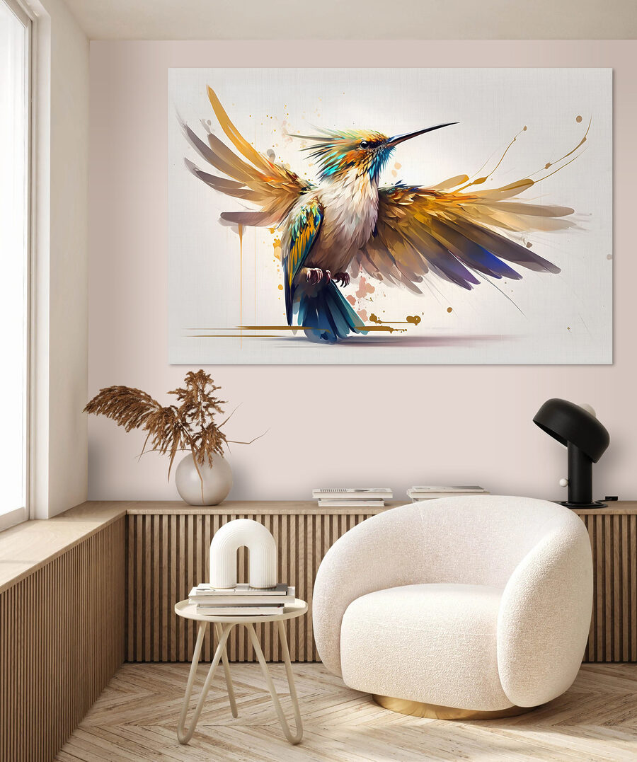 Stel je voor dat je je woonkamer binnenloopt en bam – daar is deze explosie van kleur en leven, precies op je muur. Deze canvasprint van een vogel met gespreide vleugels is alsof je een stukje tropen in huis hebt. Die kleuren zijn zo levendig, bijna alsof je de regenboog in veren gevangen hebt. En het detail – je kunt het zachte fladderen bijna voelen door er alleen maar naar te kijken. Het is speels en energiek, maar het heeft ook iets rustgevends. Perfect voor een knus hoekje waar je aan je koffie nipt, terwijl je naar deze schoonheid staart en droomt van avonturen. Ideaal voor iedereen die houdt van een vleugje kunst uit de natuur in zijn of haar nest.