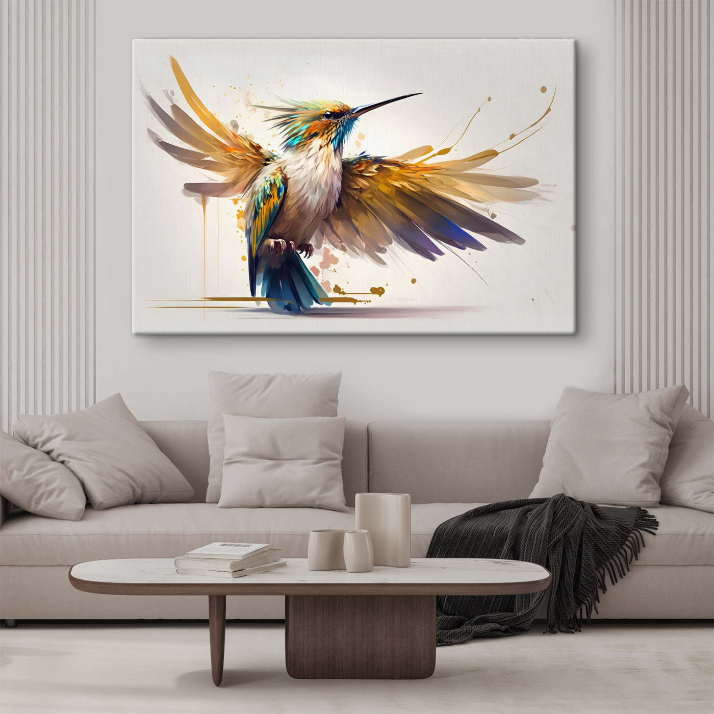 Stel je voor dat je je woonkamer binnenloopt en bam – daar is deze explosie van kleur en leven, precies op je muur. Deze canvasprint van een vogel met gespreide vleugels is alsof je een stukje tropen in huis hebt. Die kleuren zijn zo levendig, bijna alsof je de regenboog in veren gevangen hebt. En het detail – je kunt het zachte fladderen bijna voelen door er alleen maar naar te kijken. Het is speels en energiek, maar het heeft ook iets rustgevends. Perfect voor een knus hoekje waar je aan je koffie nipt, terwijl je naar deze schoonheid staart en droomt van avonturen. Ideaal voor iedereen die houdt van een vleugje kunst uit de natuur in zijn of haar nest.