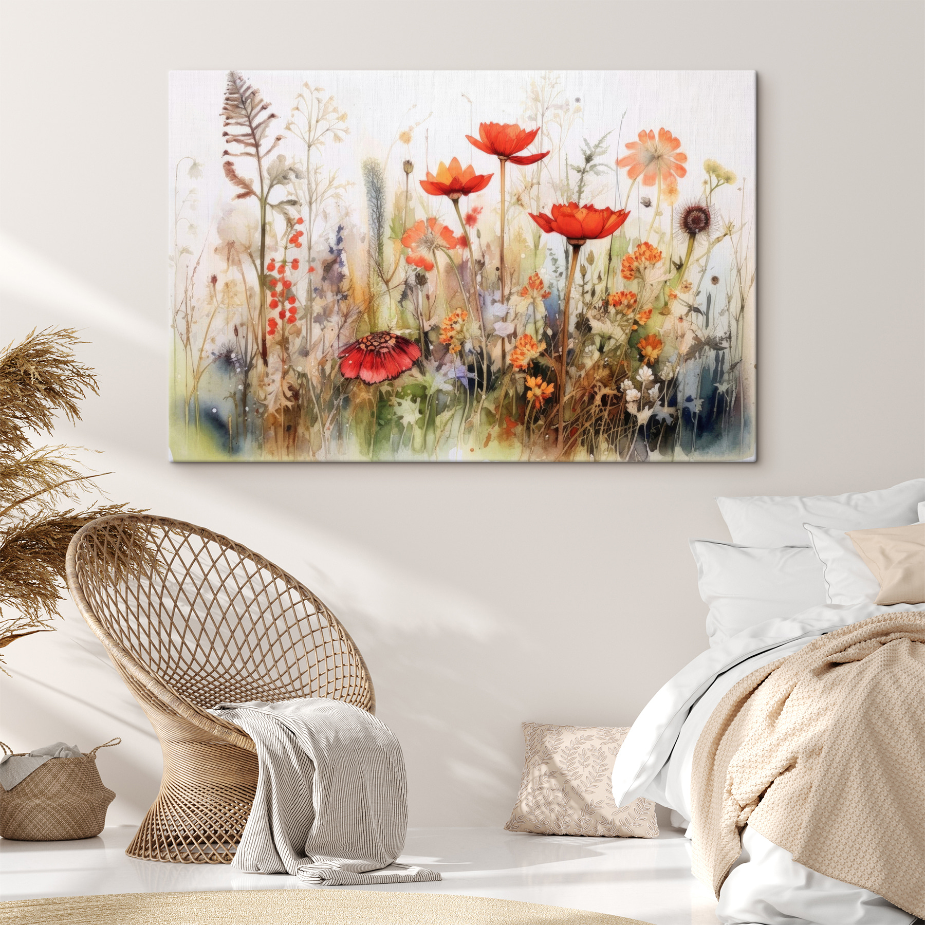 Bekijk deze canvasprint “Levendige tuin met bloeiende wilde bloemen”. Het is alsof je vanuit je woonkamer een dromerige weide binnenstapt. Felrood, oranje en een vleugje groen laten het lijken alsof de bloemen wiegen met de wind! Stel je voor dat je elke dag wakker wordt met deze kleurenpracht – het is meteen een oppepper voor je humeur. Perfect voor die lege muur die om wat liefde smeekt. En de aquarelstijl? Gewoon weelderig. Het is een stukje natuur in je huis.✨
