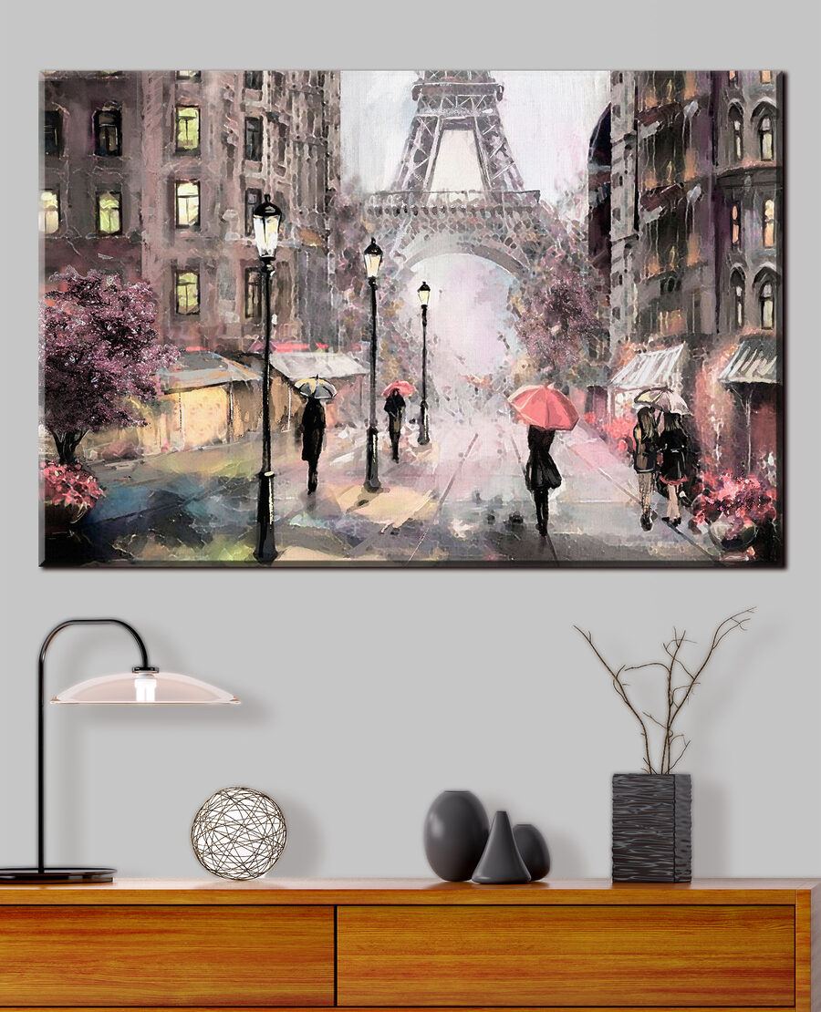 Stel je een charmante Parijse straat voor met fonkelende lichtjes en de iconische Eiffeltoren die door de mist glinstert. Deze “Rainy Day in Paris Street Scene” canvasprint brengt die dromerige, romantische sfeer direct in je interieur. De print is perfect voor liefhebbers van stadsgezichten en toont mensen die onder paraplu’s wandelen en voegt een vleugje intrige en gezelligheid toe aan elke kamer. Je kunt bijna het zachte getrippel van de regen horen en de koele Parijse bries voelen! Warm, uitnodigend en een beetje nostalgisch – het is een heerlijke manier om jezelf mee te nemen naar de Stad van de Liefde, of je er nu bent geweest of er alleen maar van droomt.