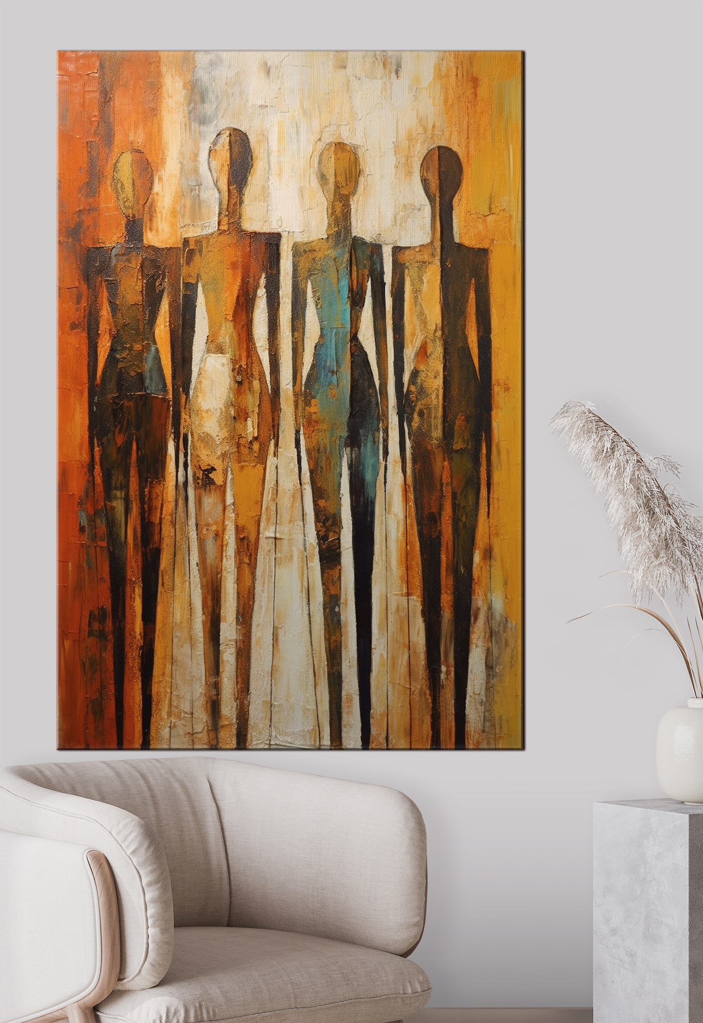 Stap in een wereld van levendige nieuwsgierigheid met deze canvasprint van een groep mensen. Stel je hun verhalen voor – stille gesprekken, herinneringen aan een zonsondergang of het ritme van muziek dat voelbaar is in hun abstracte vormen. De warme tinten dansen samen, zoals je favoriete knusse trui op een frisse herfstdag, en vullen je ruimte met een gevoel van gedeelde aanwezigheid. Perfect voor die lege muur die hunkert naar een vleugje persoonlijkheid. Het is niet zomaar kunst; het is een vleugje mysterie, een vleugje warmte en een heleboel karakter. Plaats het in je woonkamer of studeerkamer – en zie hoe het meteen een gespreksstarter wordt! Ontspan, geniet en laat je verbeelding de vrije loop telkens als je er een glimp van opvangt.